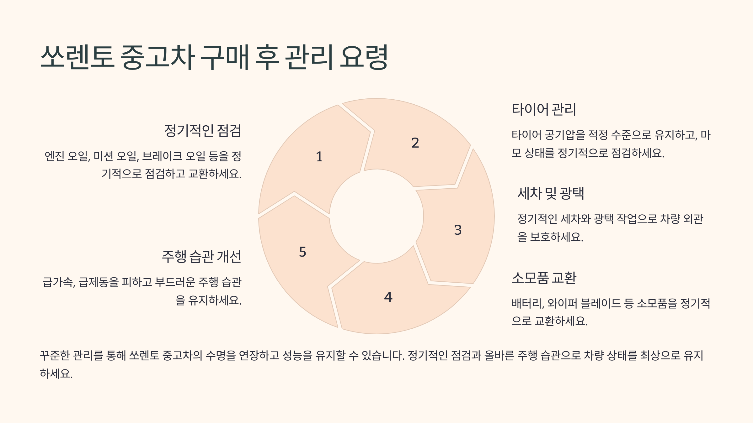 쏘렌토 중고차를 구매한 후에는 꾸준한 관리를 통해 차량의 수명을 연장하고 성능을 유지해야 합니다.