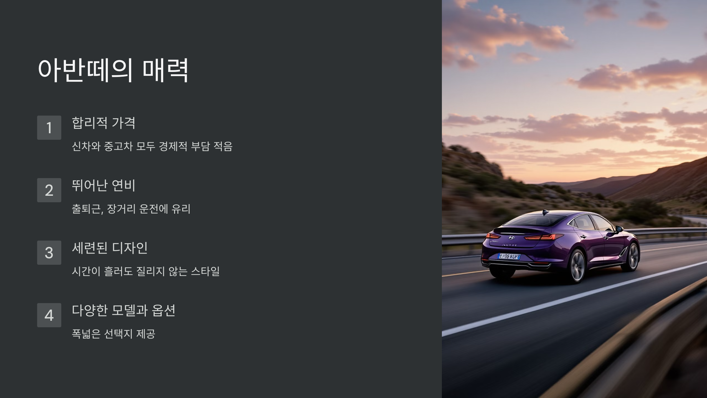 - 세련된 디자인: 시간이 흘러도 질리지 않는 세련된 디자인은 아반떼의 큰 장점 중 하나입니다.