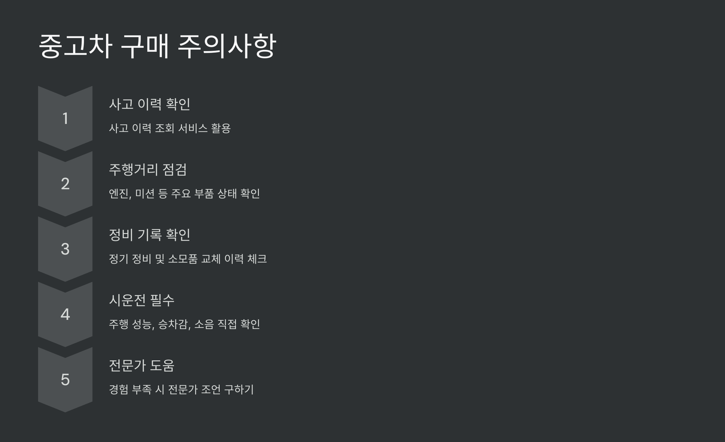 - 시운전: 반드시 시운전을 통해 차량의 주행 성능, 승차감, 소음 등을 직접 확인해야 합니다.