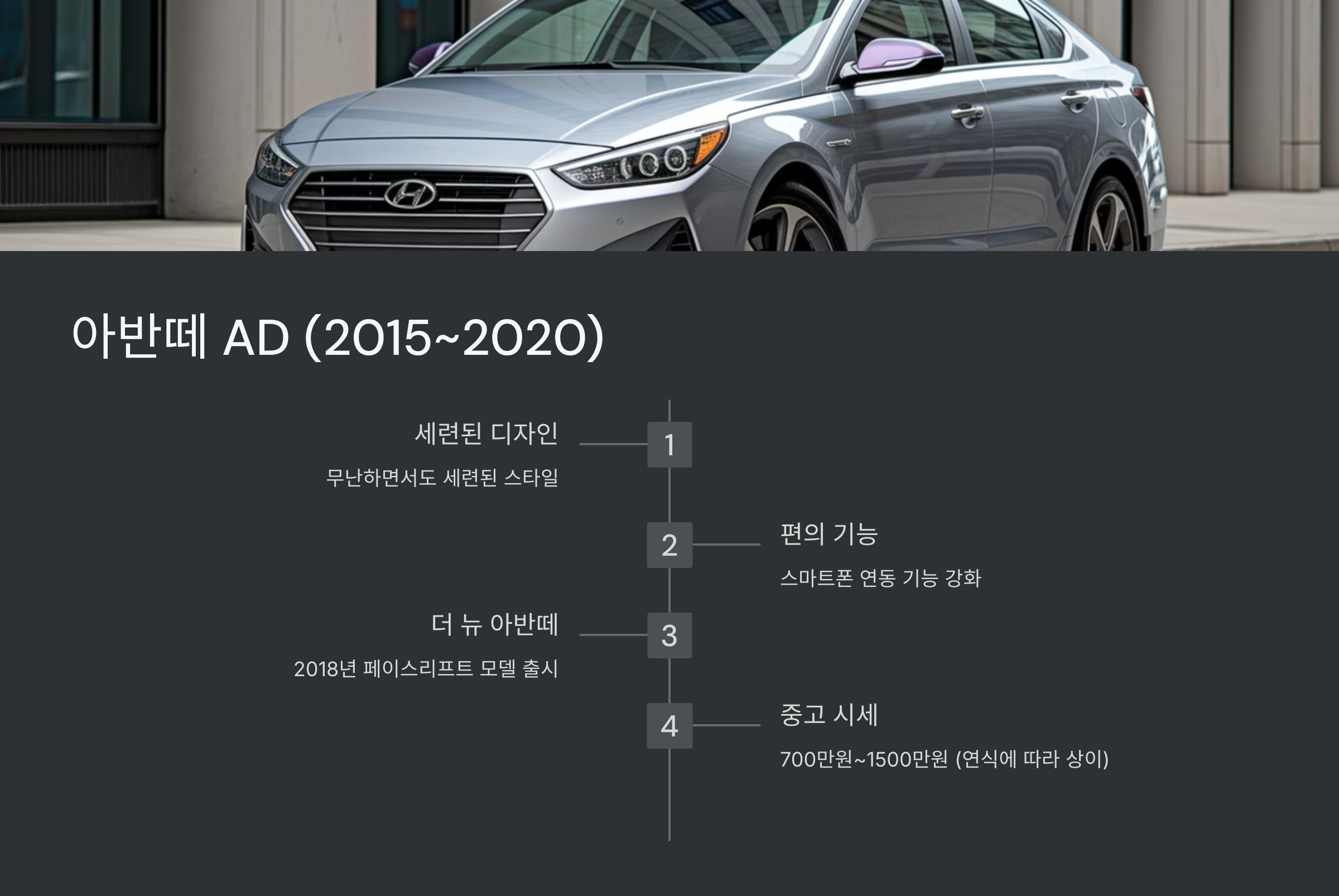 아반떼 AD는 2015년부터 2020년까지 생산된 모델입니다. 세련된 디자인과 안정적인 성능으로 꾸준한 인기를 얻고 있습니다.