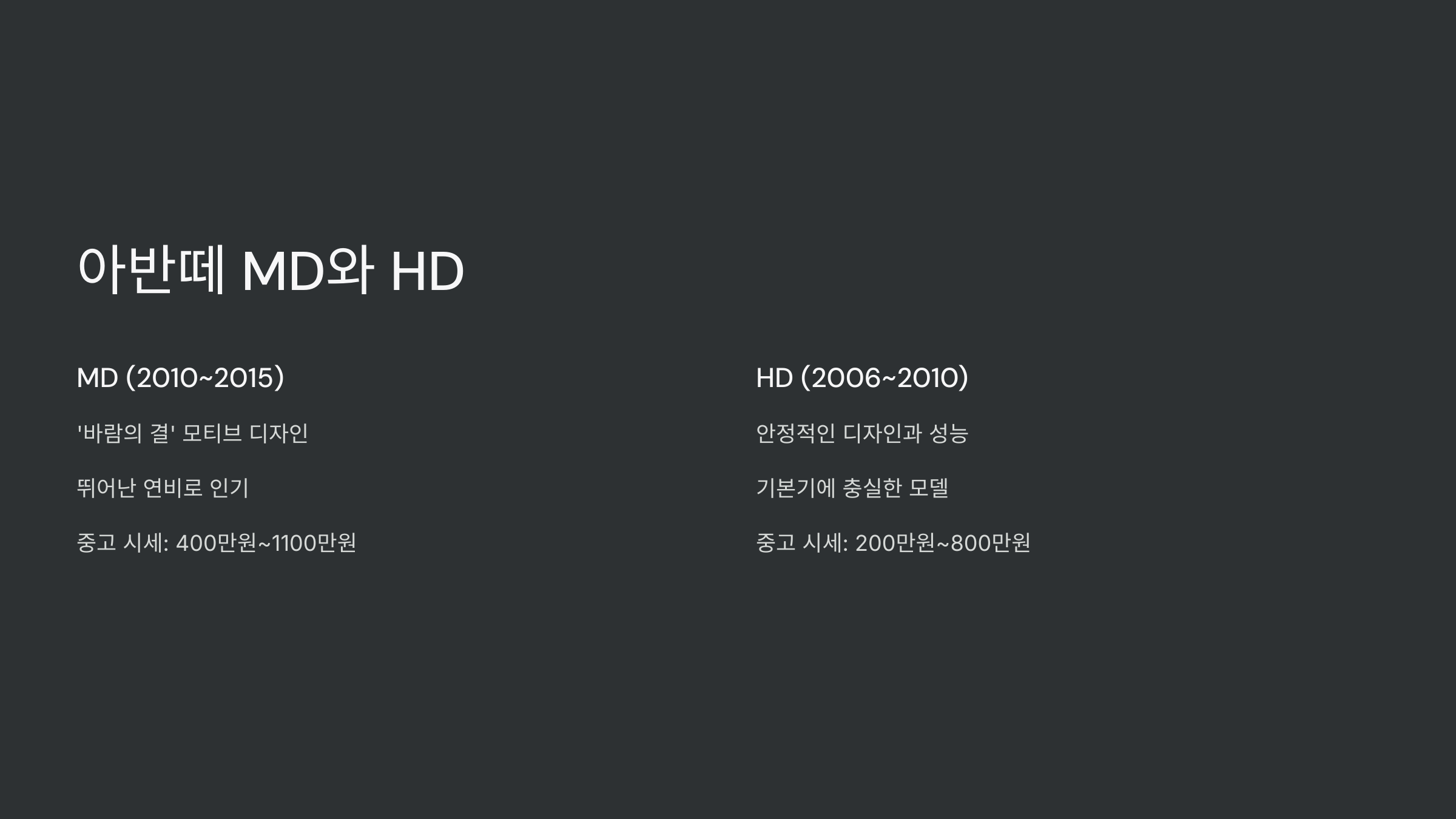 - 다양한 모델: HD, MD, AD, CN7 등 다양한 모델이 출시되어 폭넓은 선택지를 제공합니다.