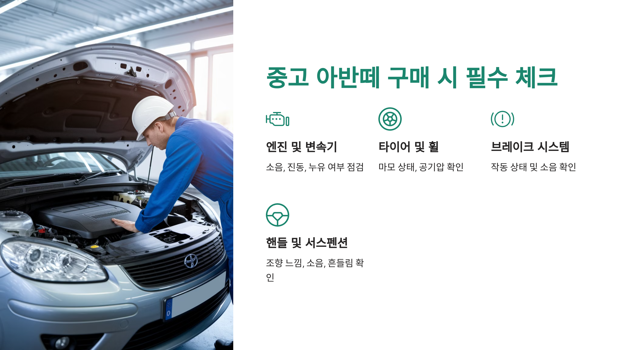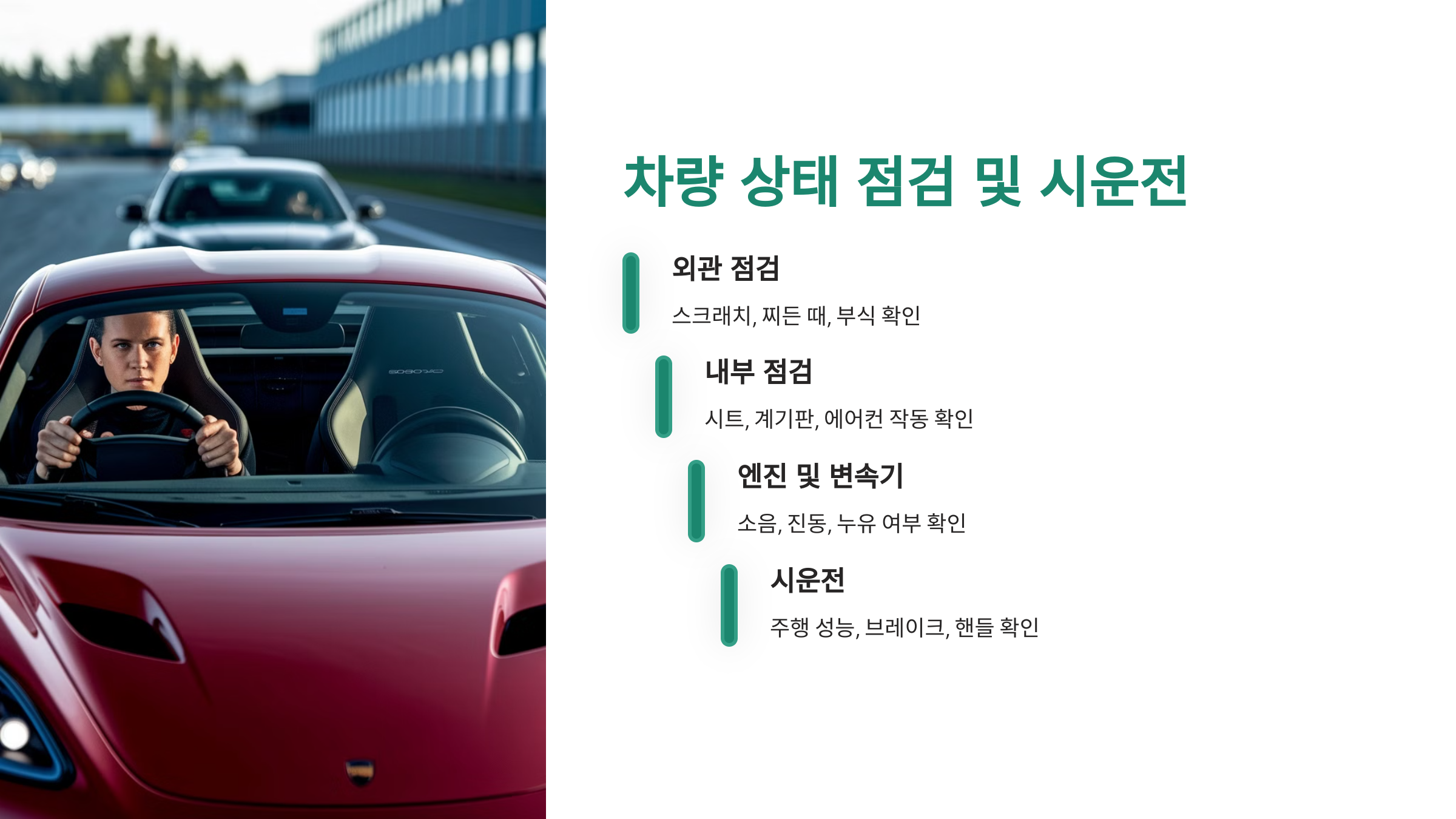 - 시운전: 반드시 시운전을 통해 차량의 주행 성능, 승차감, 소음 등을 확인합니다.