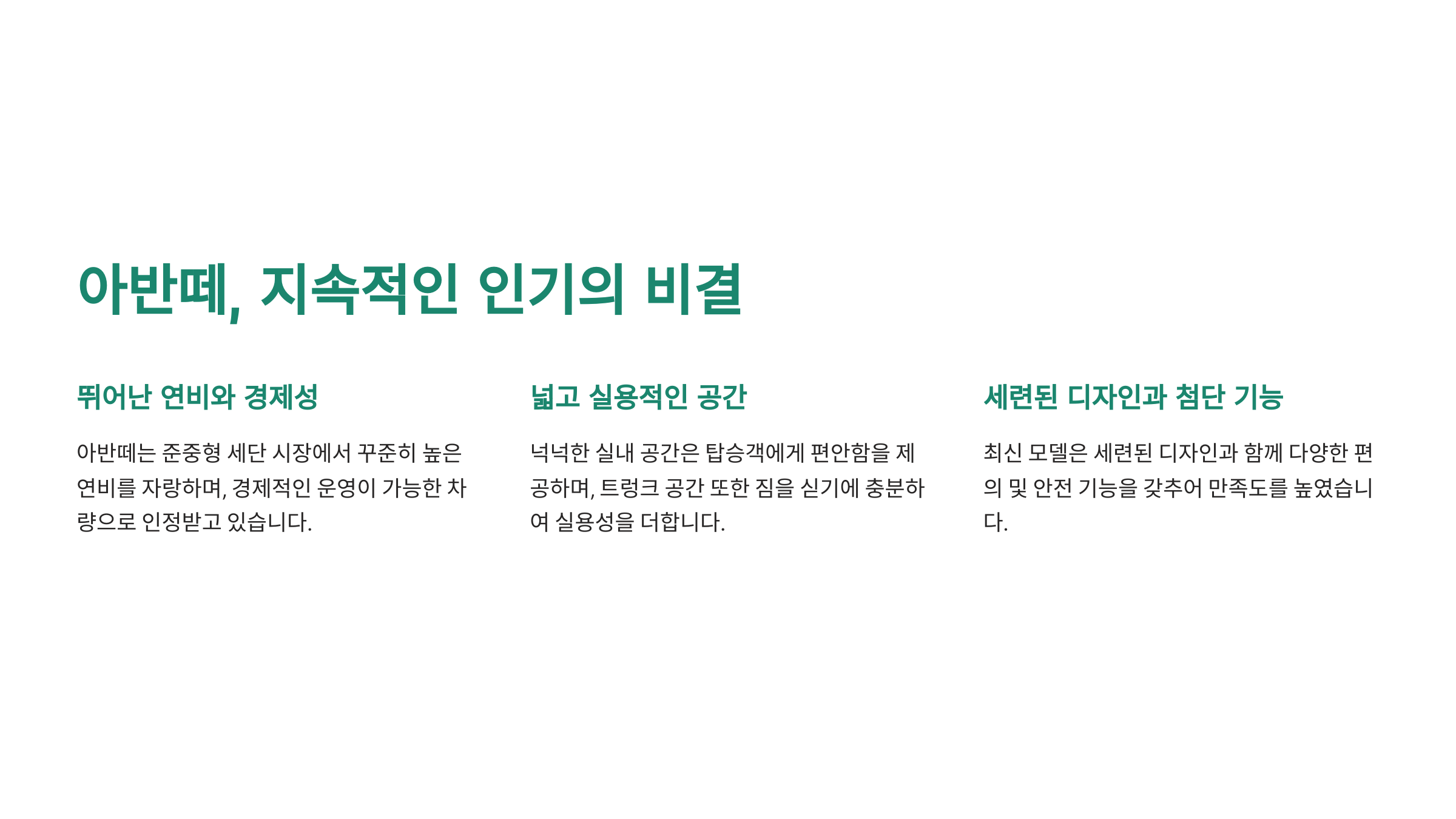 - 경제성: 아반떼는 뛰어난 연비를 자랑하며, 유지비 부담이 적습니다. 특히 하이브리드 모델은 더욱 뛰어난 경제성을 제공합니다.