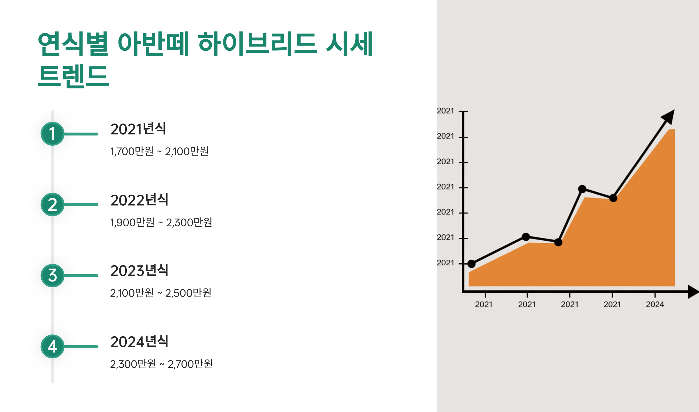 2021년식 아반떼 하이브리드는 CN7 모델의 초기 연식으로, 현재 중고차 시장에서 비교적 저렴하게 구매할 수 있습니다.