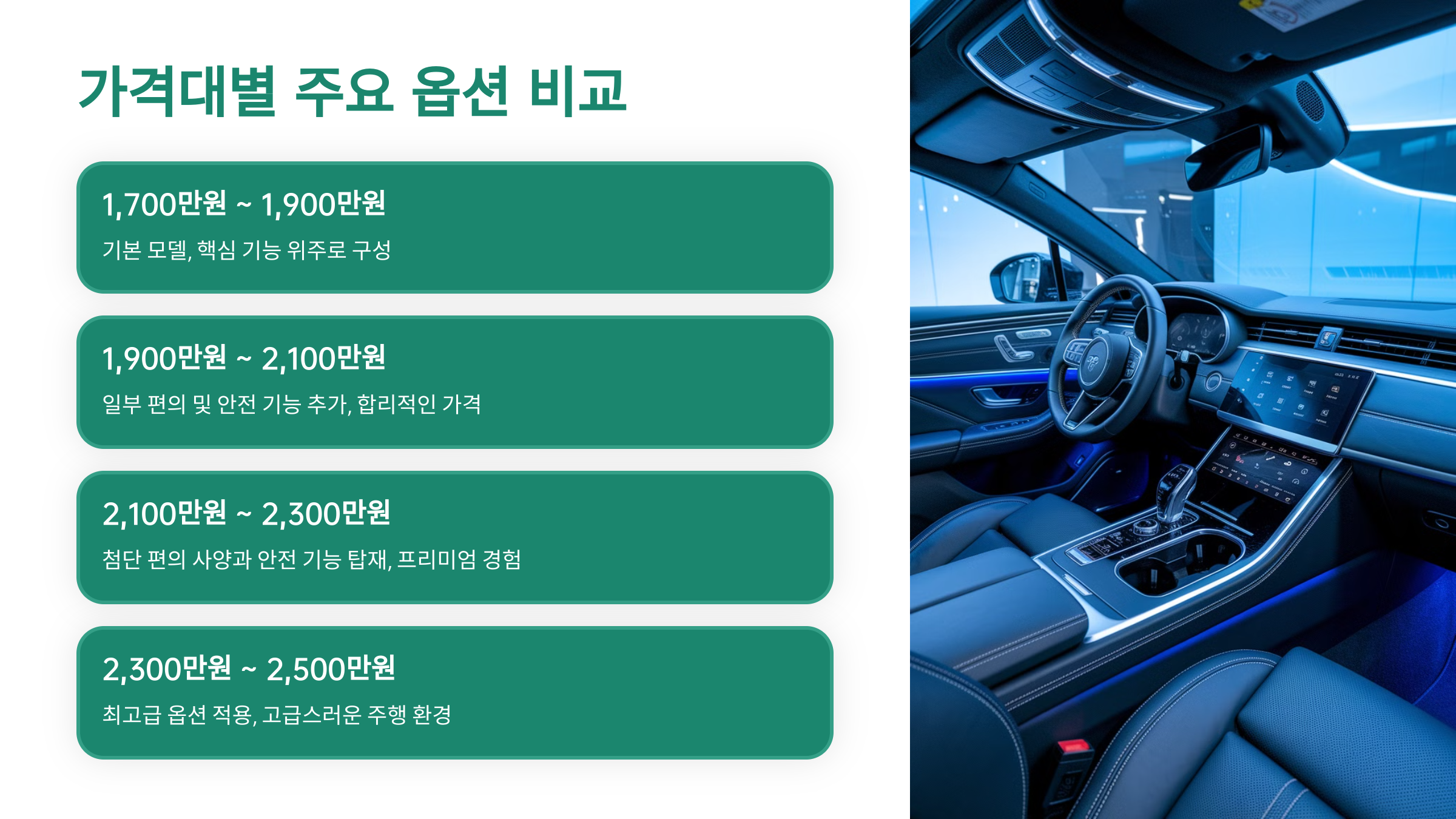 - 예산 설정: 구매 가능한 예산을 먼저 설정하고, 예산에 맞는 연식과 트림을 선택합니다.