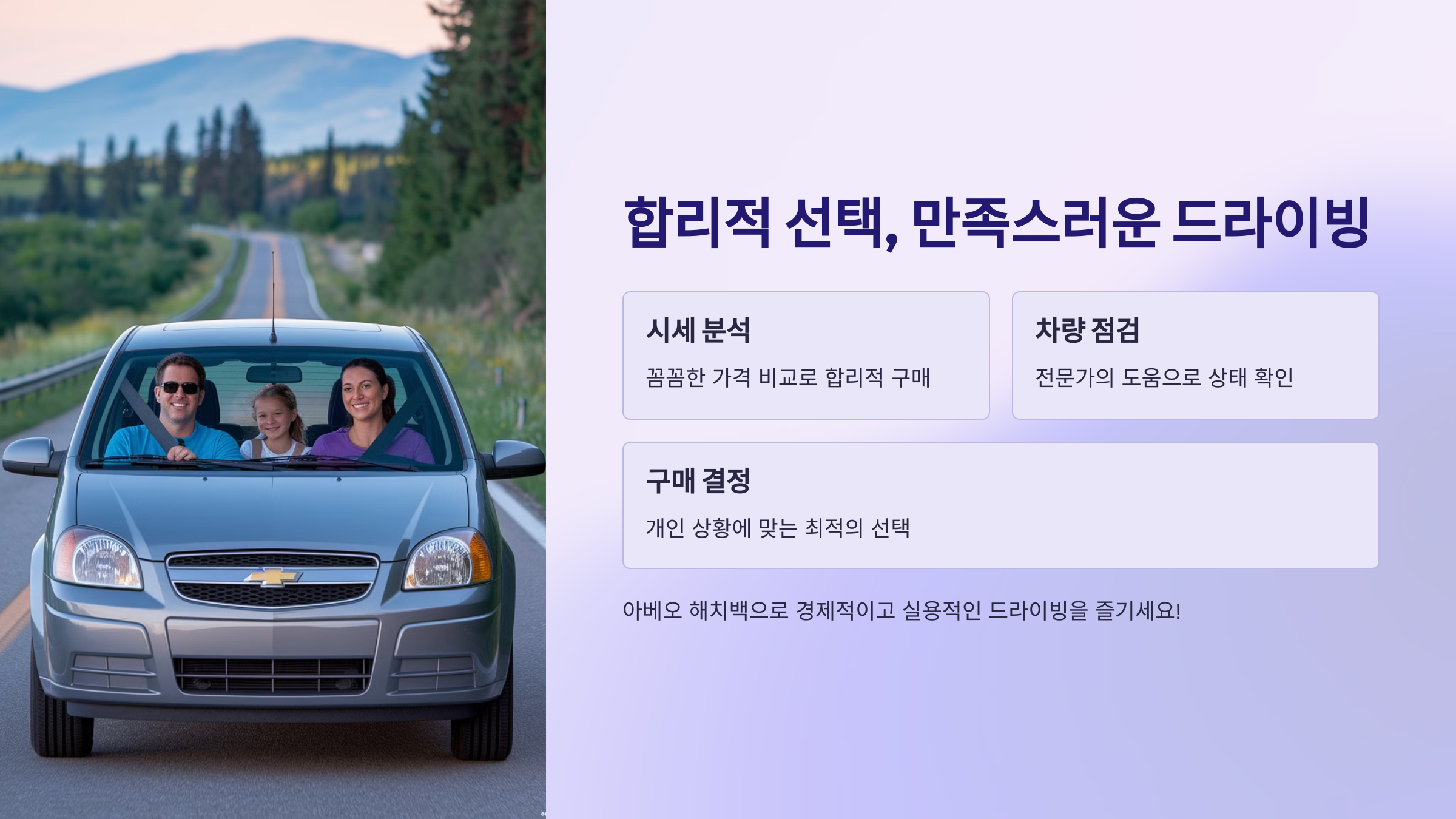 아베오 해치백 중고차 가격은 경제적인 해치백을 찾는 사람들에게 매력적인 선택지입니다. 꼼꼼한 시세 분석과 차량 점검을 통해 합리적인 가격에 좋은 차량을 구매할 수 있습니다. 이 글에서 제시된 정보들을 바탕으로, 여러분이 만족스러운 아베오 해치백 중고차를 선택하고 즐거운 드라이빙을 경험하시길 바랍니다.