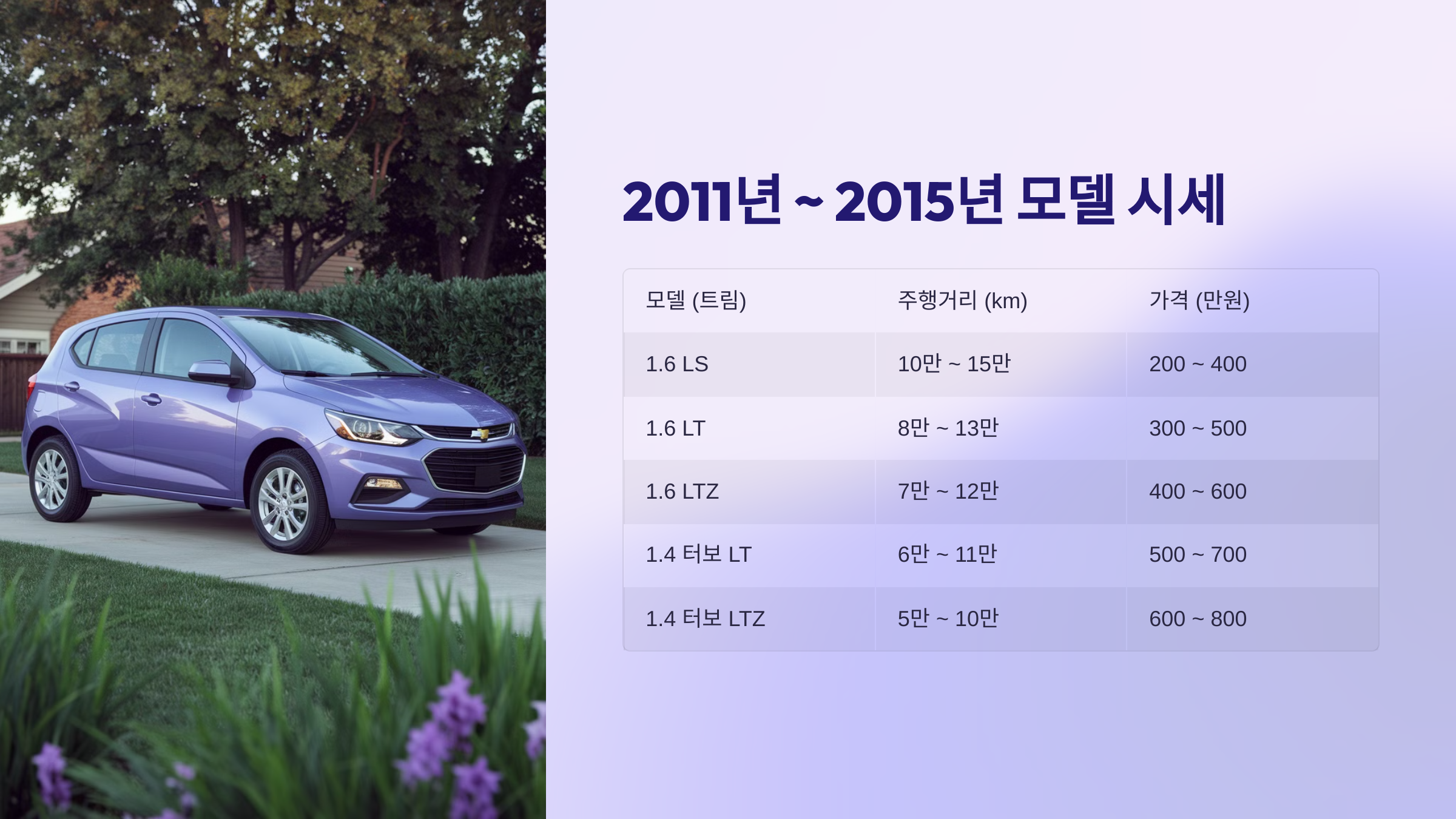 - 참고: 2011년~2015년식 아베오 해치백은 연식이 오래된 만큼, 차량 상태를 꼼꼼히 확인하는 것이 중요합니다. 특히 엔진, 미션, 하체 부식 등을 중점적으로 점검해야 합니다.