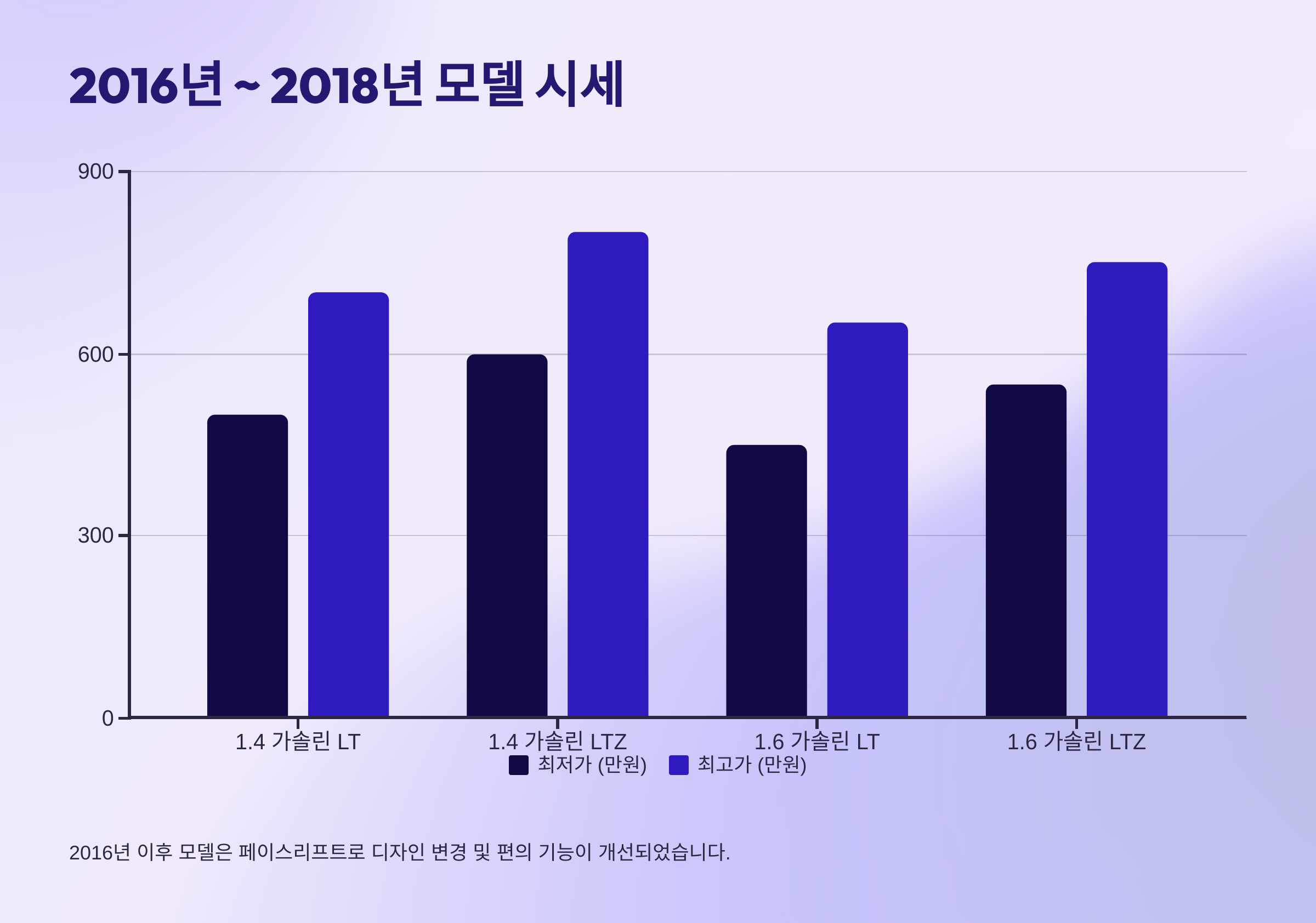 | 1.6 가솔린 LT | 6만 ~ 11만 | 450 ~ 650 | 1.4 가솔린 모델 대비 저렴한 가격 |