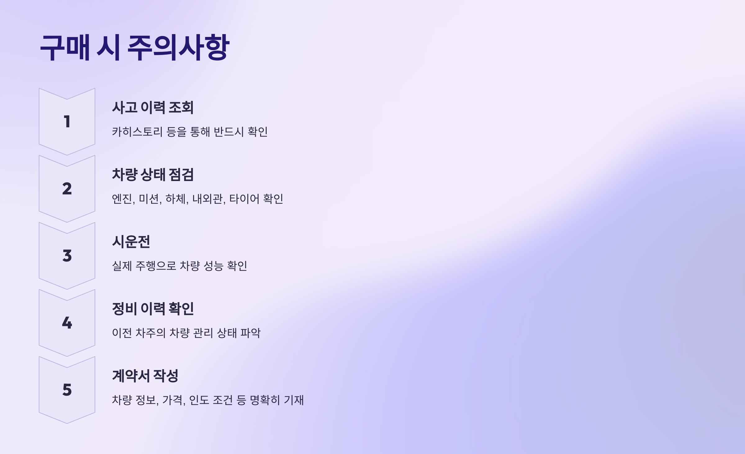 - 개인 직거래: 중고차 매매 수수료를 절약할 수 있지만, 차량 상태 점검 및 사고 처리 등 모든 책임을 구매자가 져야 합니다.