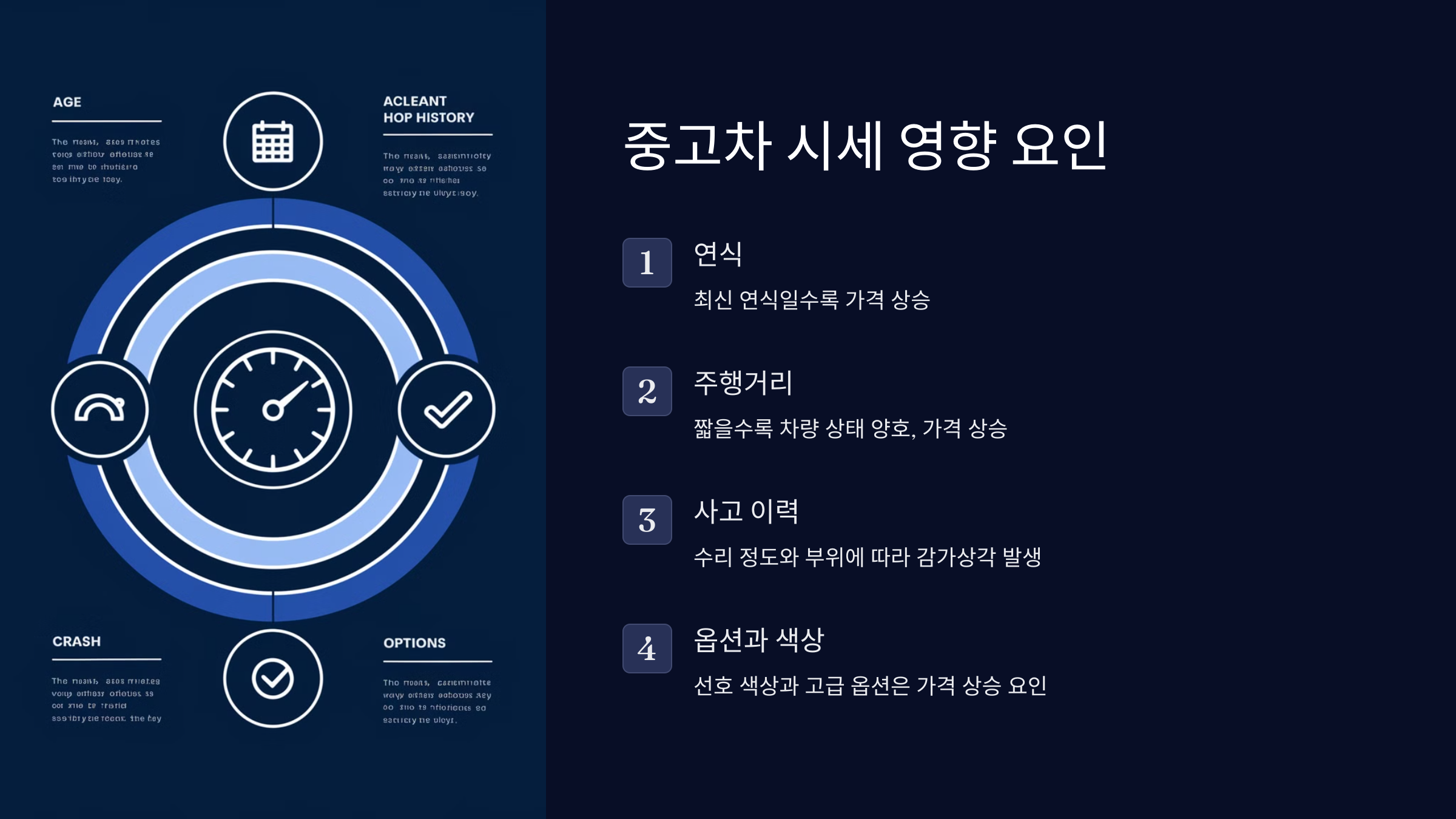 - 옵션: 선루프, 내비게이션, 가죽 시트 등 다양한 옵션은 차량의 가치를 높여 가격 상승에 영향을 미칩니다.