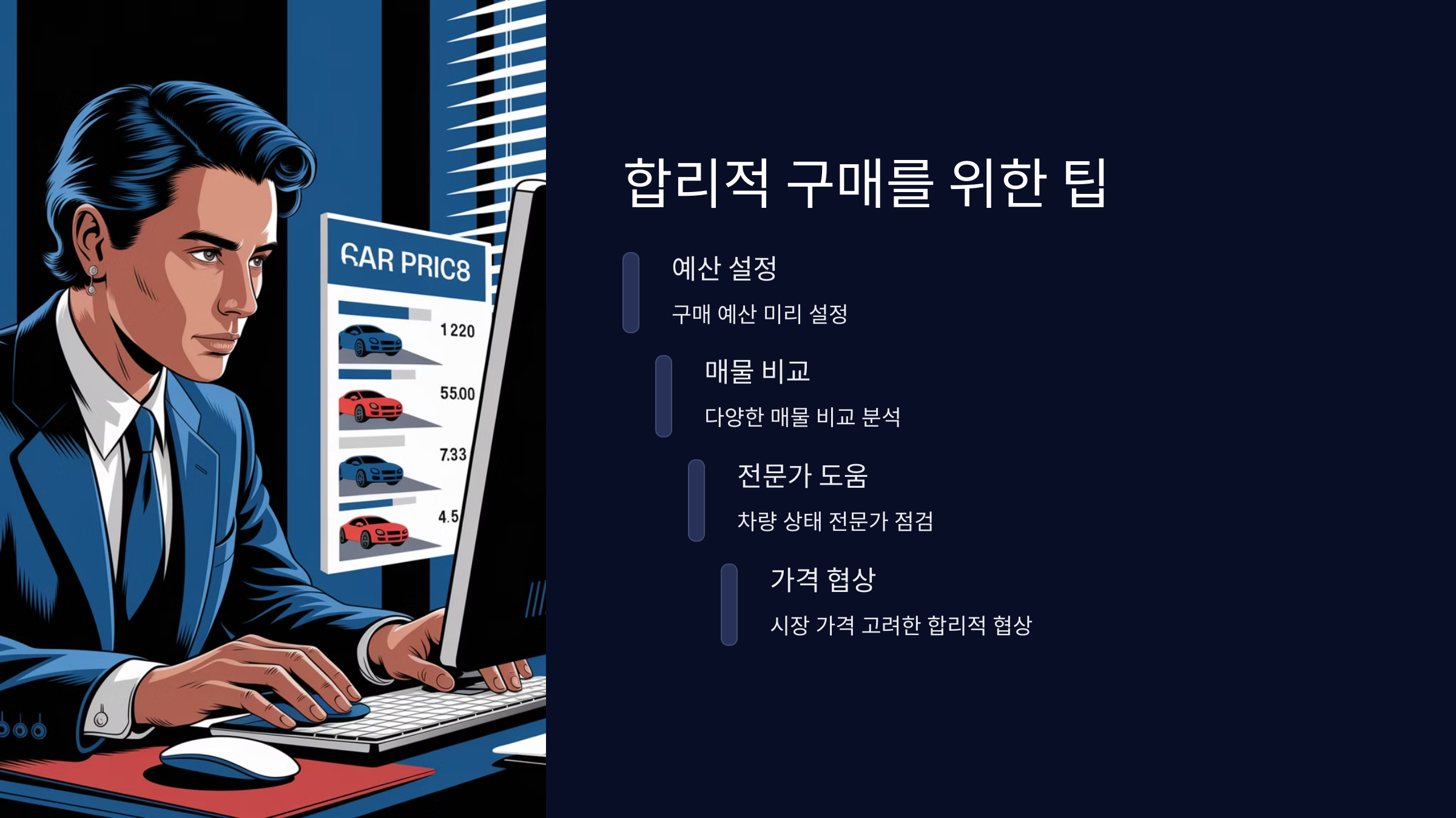 - 예산 설정: 구매 예산을 미리 설정하고, 예산 범위 내에서 원하는 모델과 연식을 선택하는 것이 좋습니다.