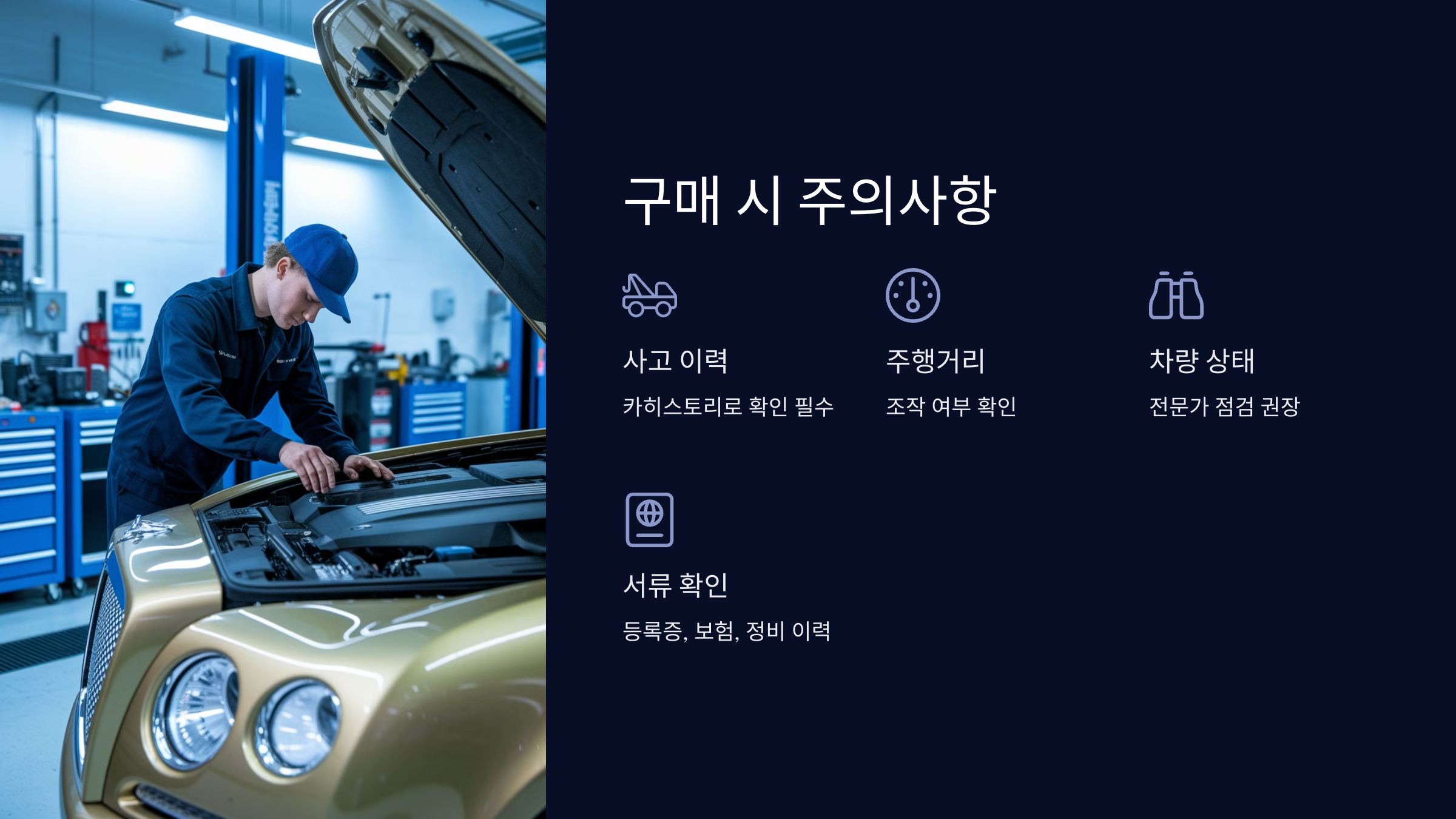 - 시운전: 반드시 시운전을 통해 차량의 승차감, 핸들링, 엔진 소음 등을 확인해야 합니다.
