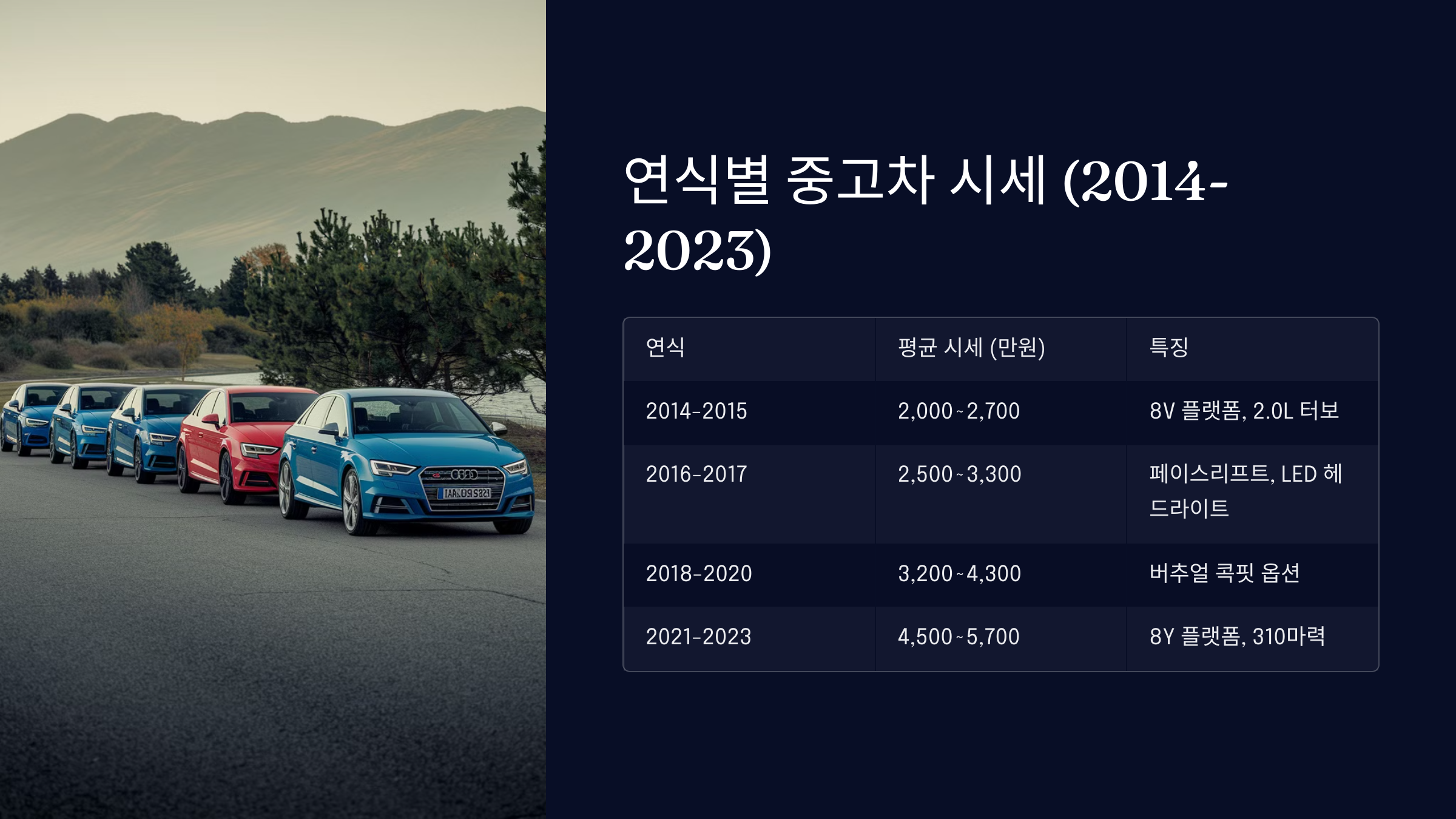 | 2014년 | S3 2.0 TFSI | 2,000 ~ 2,500 | 8V 플랫폼 기반, 2.0L 터보 엔진, 7단 S 트로닉 변속기. 비교적 저렴한 가격으로 S3를 경험할 수 있는 연식. |