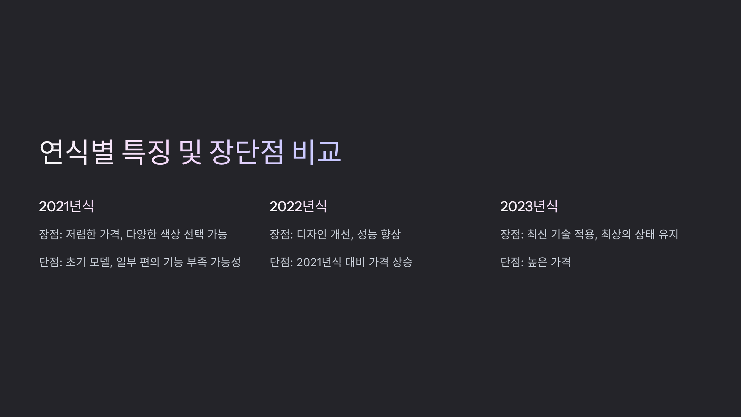 - 2023년: 최신 기술이 적용된 모델로, 가장 높은 가격대를 형성하고 있습니다.