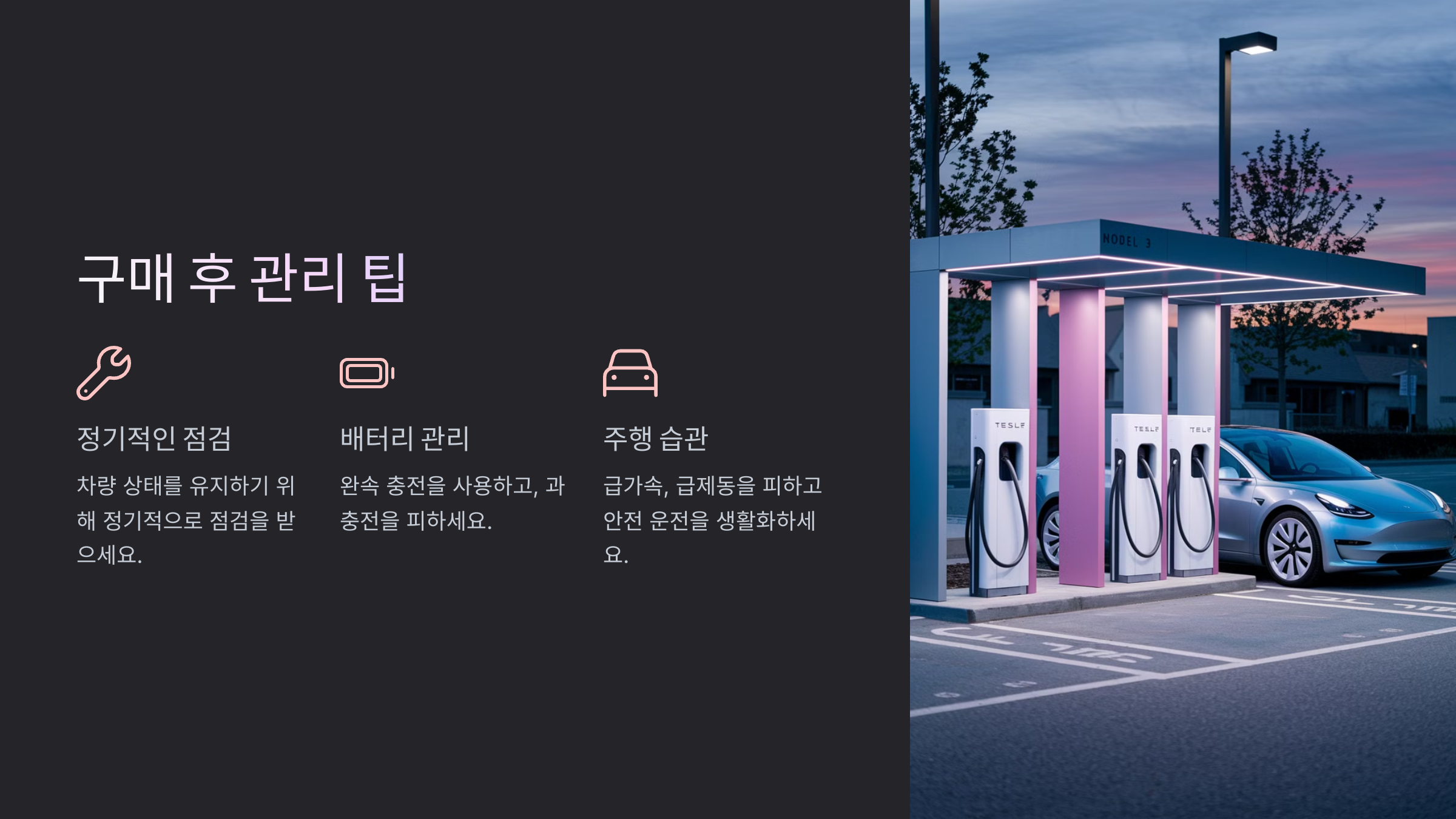 - 배터리 관리: 급속 충전보다는 완속 충전을 사용하는 것이 배터리 수명 연장에 도움이 됩니다. 또한, 배터리를 완전히 방전시키거나 과충전하지 않도록 주의해야 합니다.