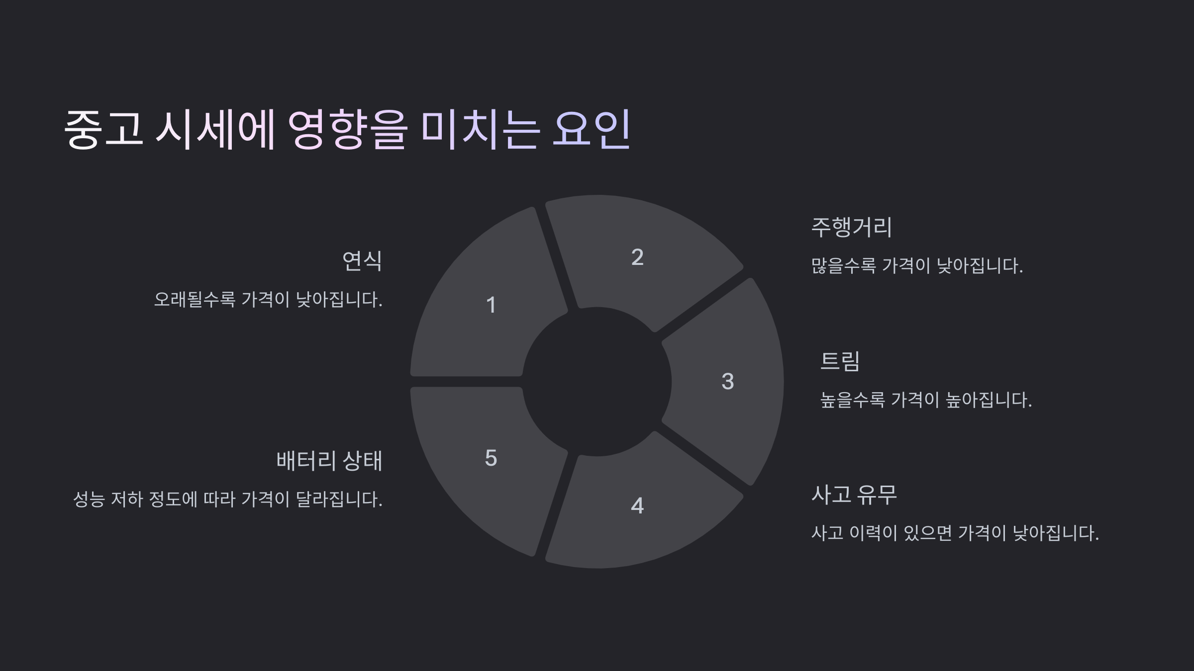 - 사고 유무: 사고 이력이 있는 차량은 감가상각이 크게 발생하여 가격이 낮아집니다.
