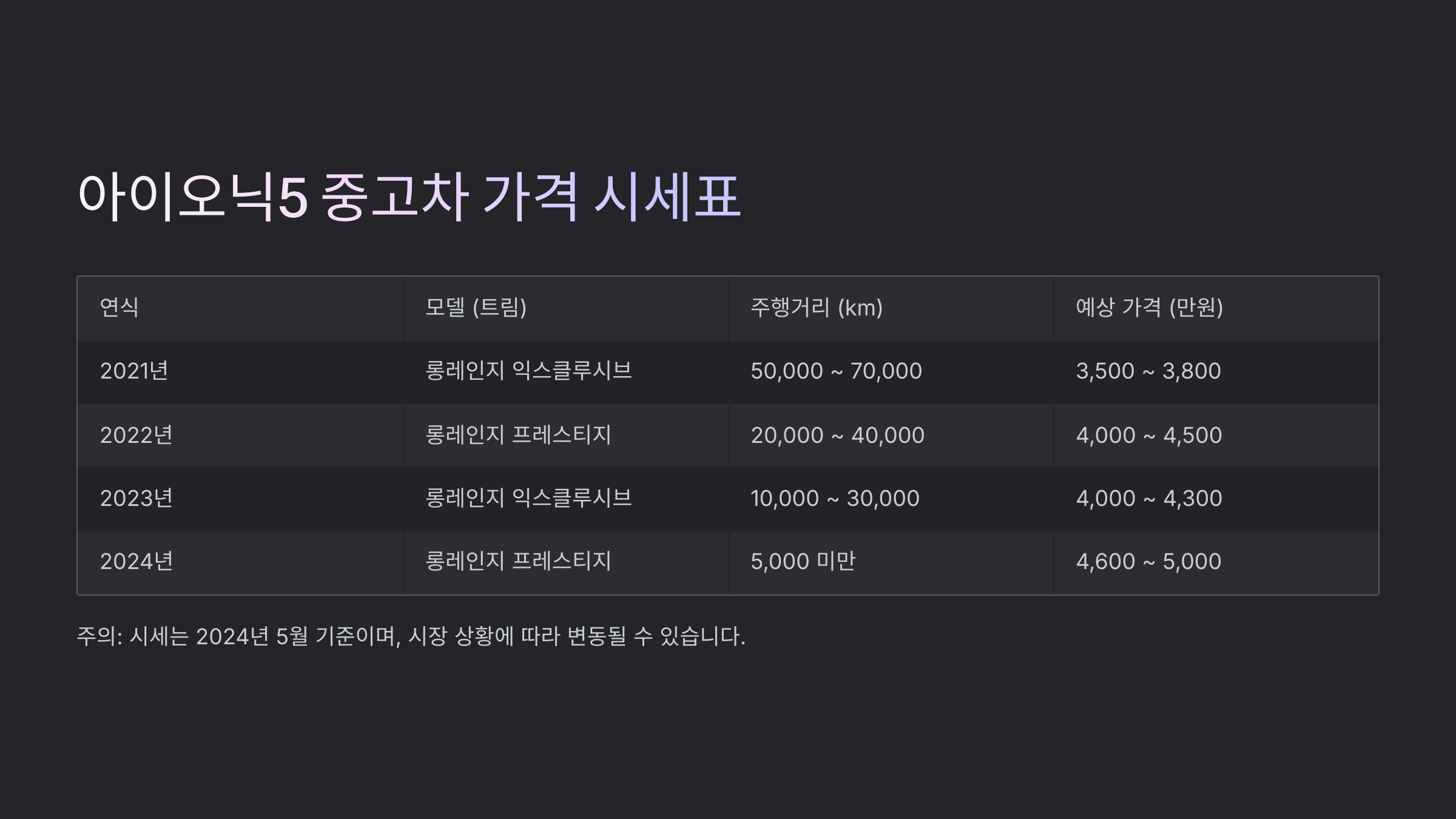 아이오닉5 중고차 가격은 연식, 트림, 주행거리, 사고 유무, 옵션 등에 따라 크게 달라집니다. 아래 표는 현재 중고차 시장에서 거래되는 아이오닉5의 평균 시세를 나타낸 것입니다. 이 표를 참고하여 자신에게 맞는 아이오닉5를 찾아보세요.