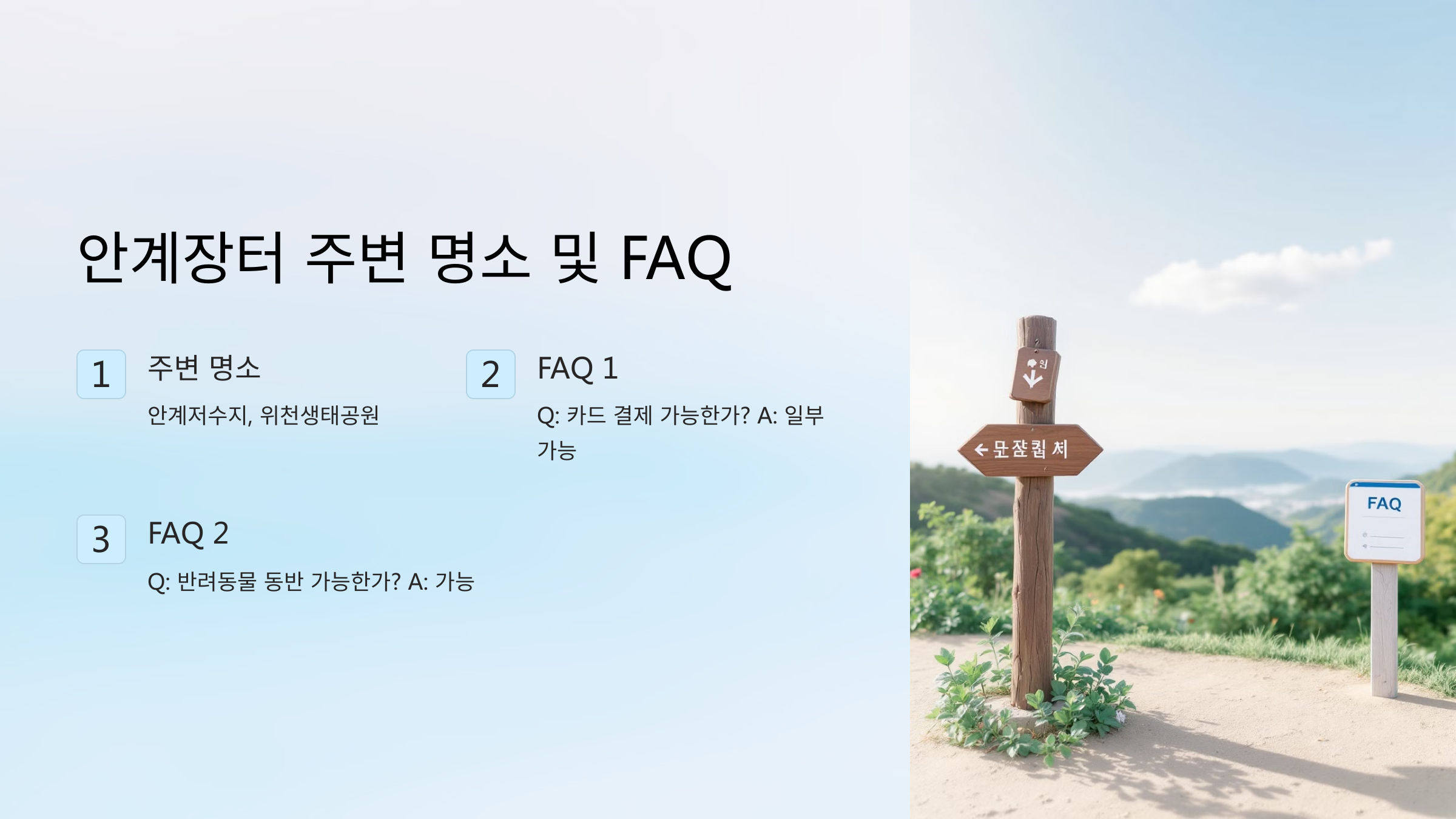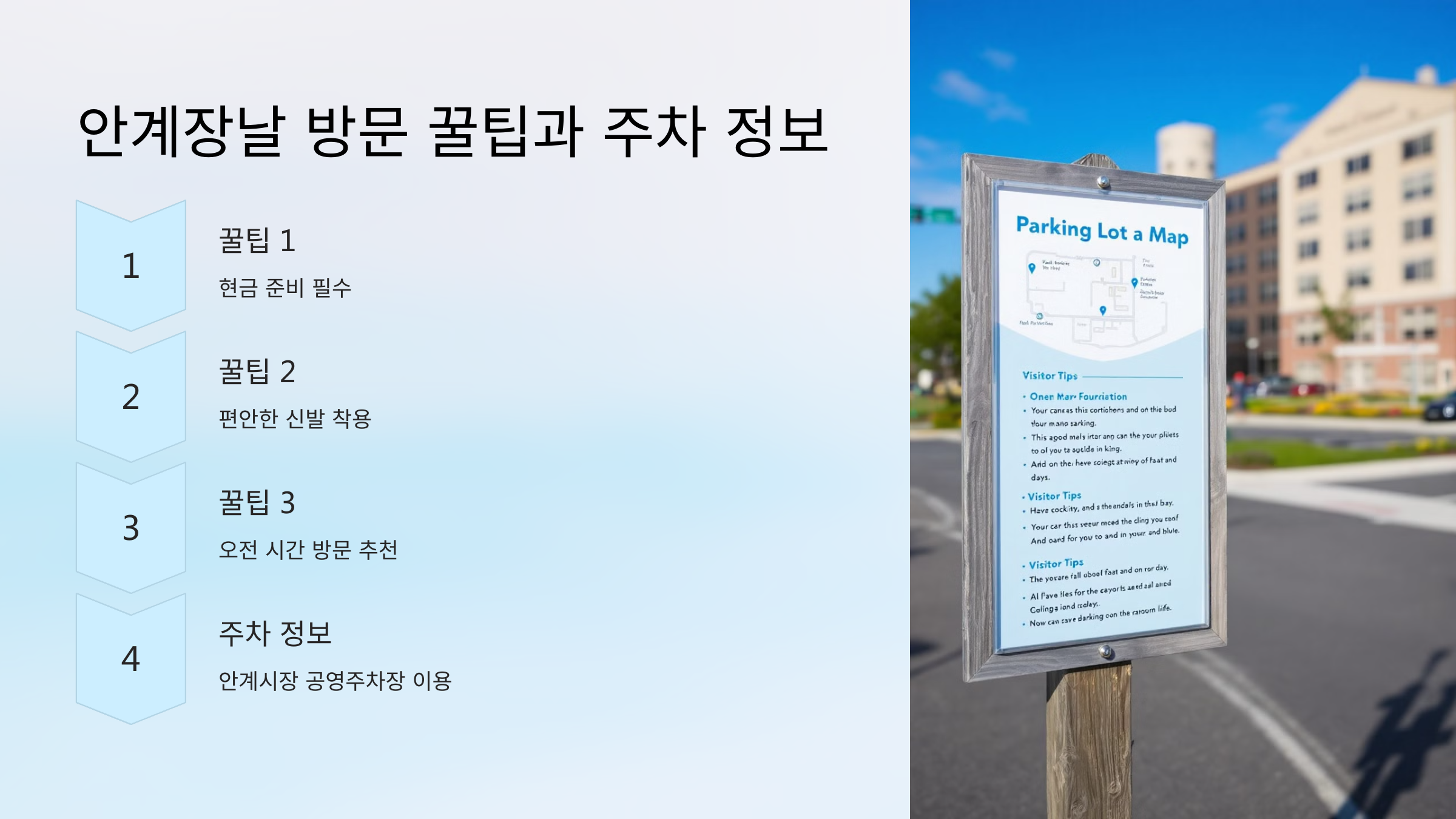 A3. 안계면 공영주차장, 안계초등학교 부근, 시장 주변 임시 주차장을 이용할 수 있어요. 모두 무료로 운영되지만 장날 오전 10시 이후에는 혼잡할 수 있으니 일찍 도착하는 게 좋아요. 🚗