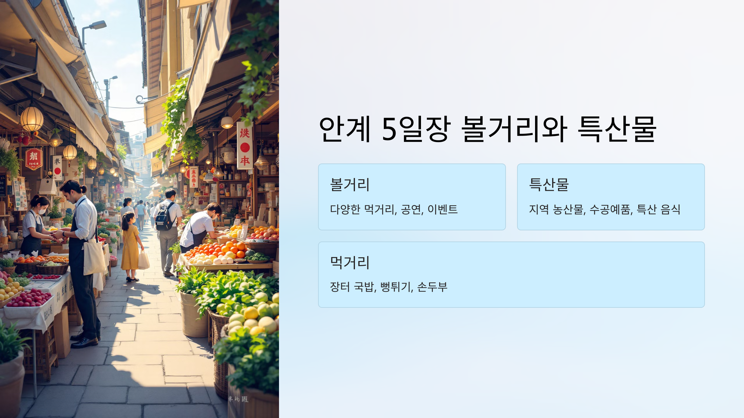또한, 안계 5일장은 문화예술 활동과도 연결되어 있어요. 지역 예술가들이 작품을 전시하거나, 거리 공연이 열리는 경우도 있어요. 전통적인 삶의 방식과 현대적인 요소가 공존하는 곳이 바로 이 장터랍니다!