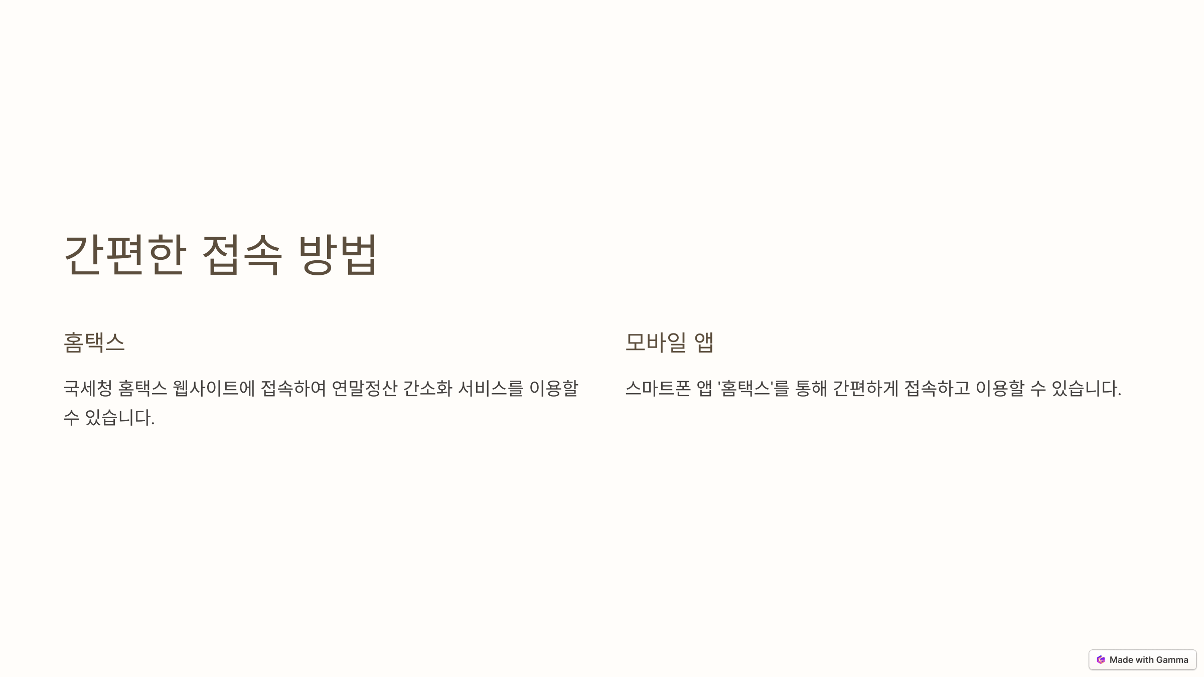 연말정산 간소화 서비스를 이용하려면, 국세청 홈택스 웹사이트나 모바일 앱에 접속해야 해요. 주요 접속 방법과 절차는 아래와 같아요: