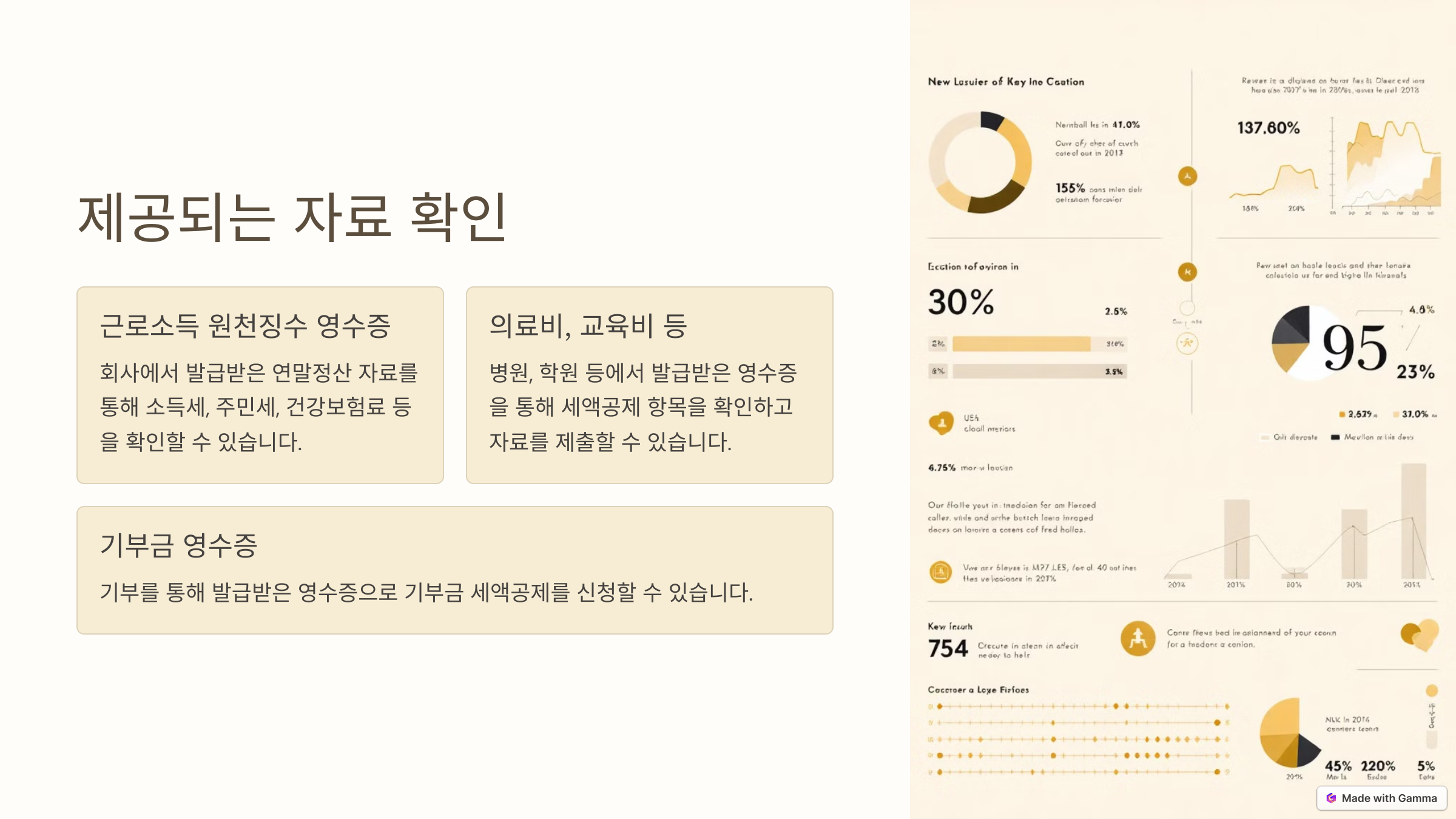이 시스템은 의료비, 교육비, 기부금 등 다양한 공제 항목의 자료를 모아주기 때문에, 사용자는 별도로 증빙자료를 일일이 챙길 필요가 없어요. 다만, 본인의 공제 대상 자료가 모두 제대로 반영되었는지 꼼꼼히 확인하는 것이 중요해요.