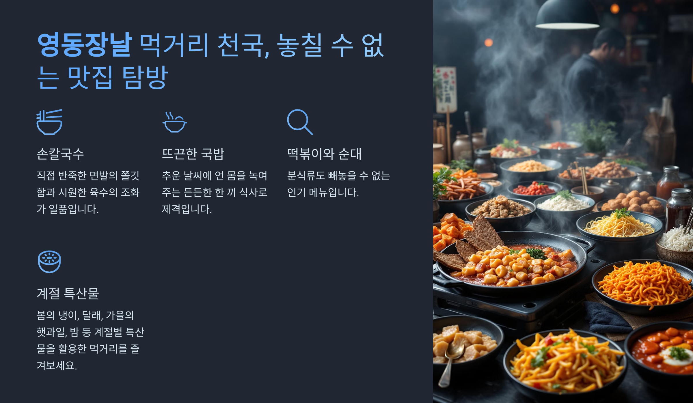 | 대표 음식 | 국밥, 칼국수, 떡볶이 |