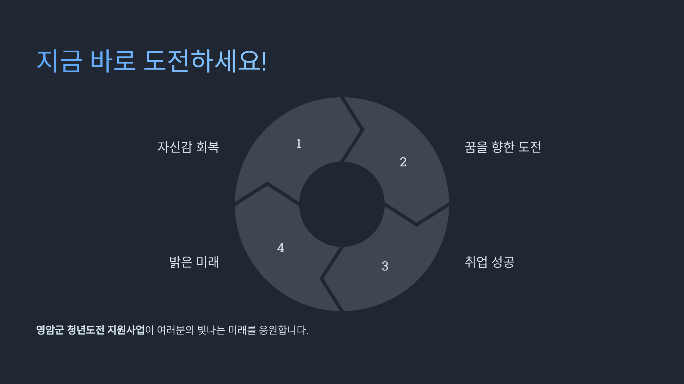 영암군 청년도전 지원사업은 단순한 일자리 제공을 넘어, 청년들이 자신감을 회복하고 꿈을 향해 나아갈 수 있도록 돕는 의미 있는 사업입니다. 망설이지 말고 지금 바로 영암군 청년도전 지원사업에 참여하여 빛나는 미래를 만들어 보세요! 영암군 청년도전 지원사업이 여러분의 빛나는 미래를 응원합니다.