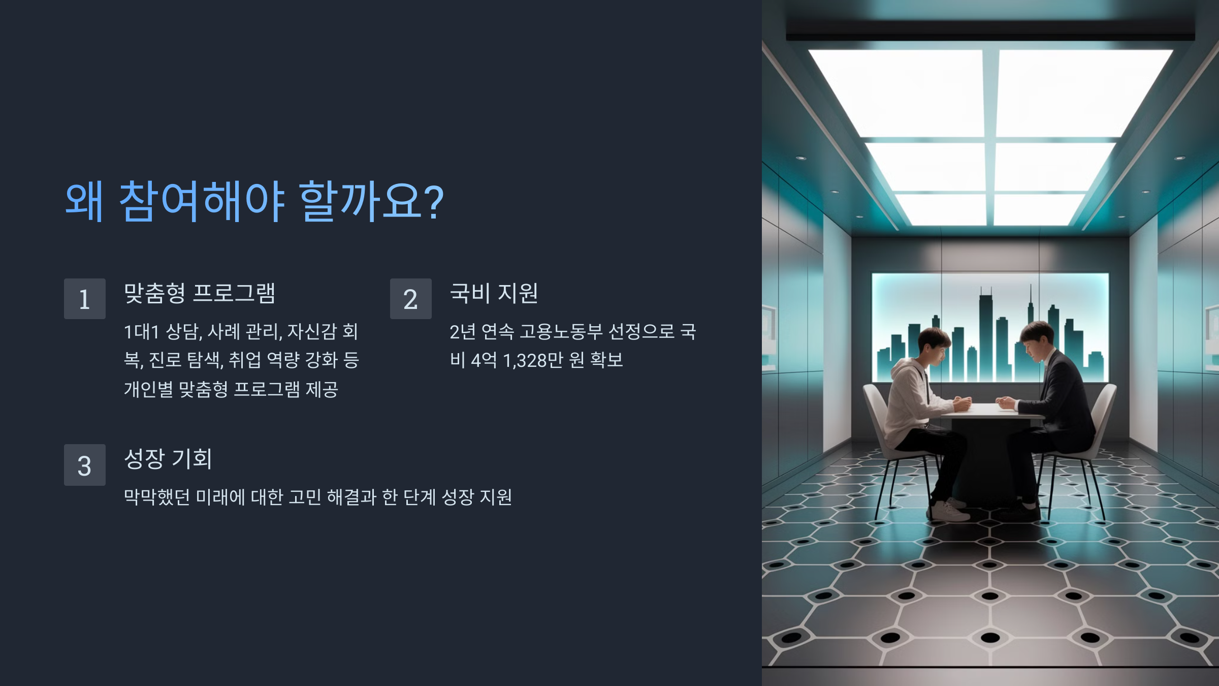 주요 프로그램 | 1대1 상담, 사례 관리, 자신감 회복, 진로 탐색, 취업 역량 강화 |