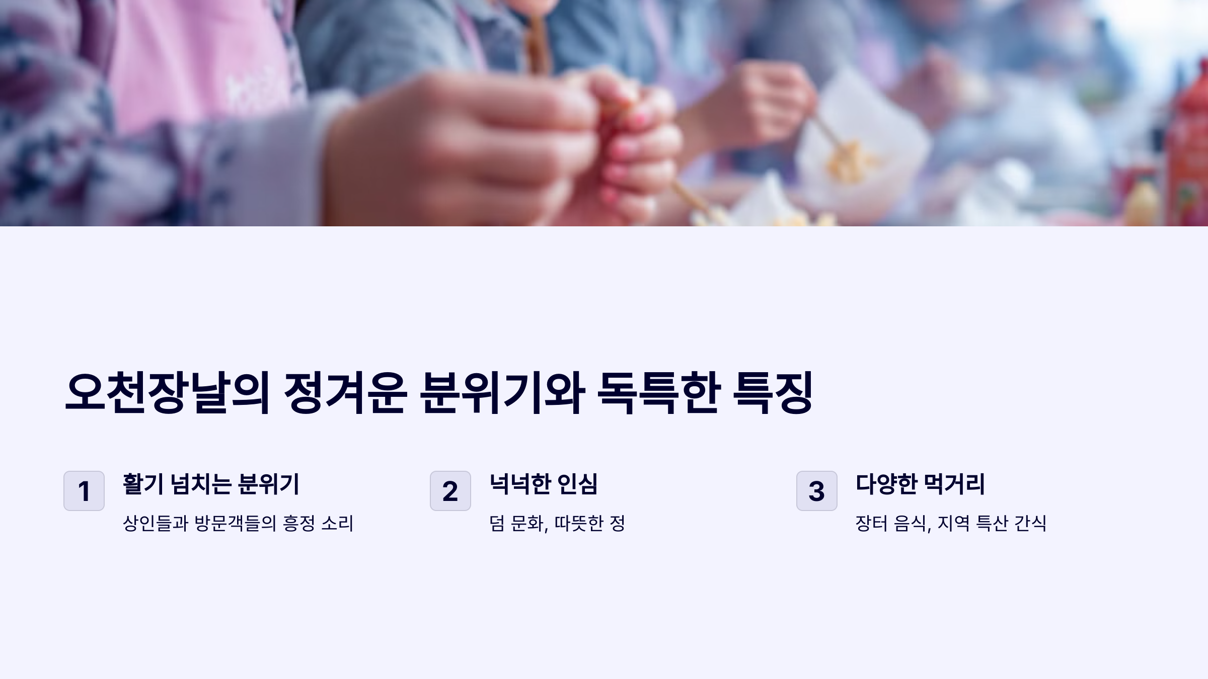 오천장은 단순한 시장이 아니라 지역 문화를 경험할 수 있는 곳이에요. 장날이 되면 평소 조용한 마을이 활기찬 에너지가 넘치는 공간으로 변하죠.
