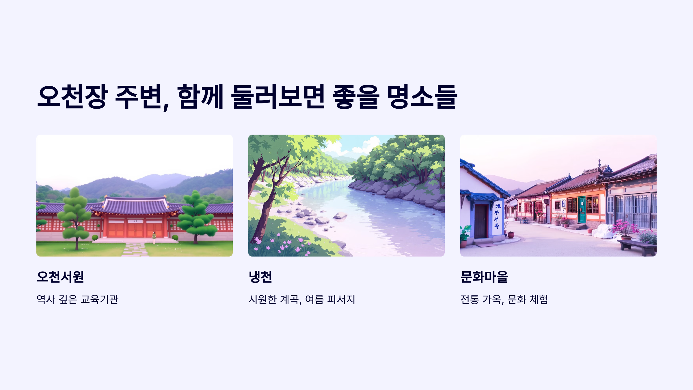 이렇게 오천장을 다녀온 후 주변 명소까지 둘러보면 더욱 알찬 여행이 될 거예요. 😊