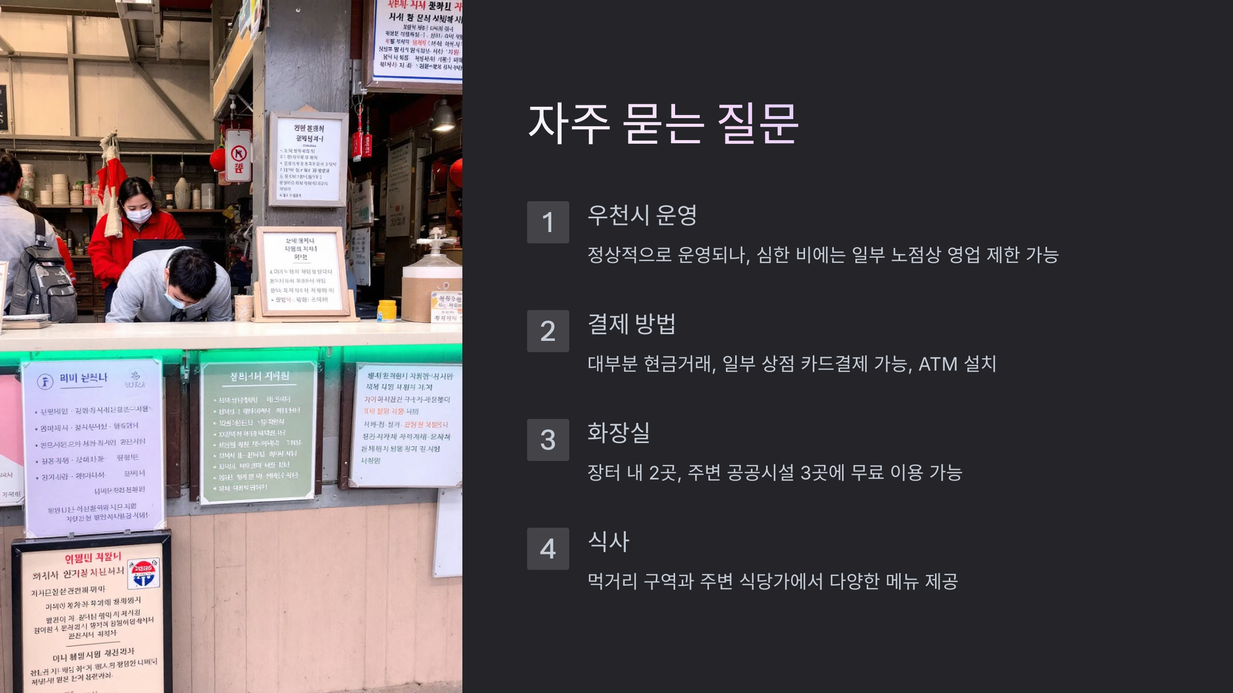 A: 네, 우천시에도 정상적으로 운영됩니다. 다만 비가 매우 심한 날은 일부 노점상인들의 영업이 제한될 수 있습니다.