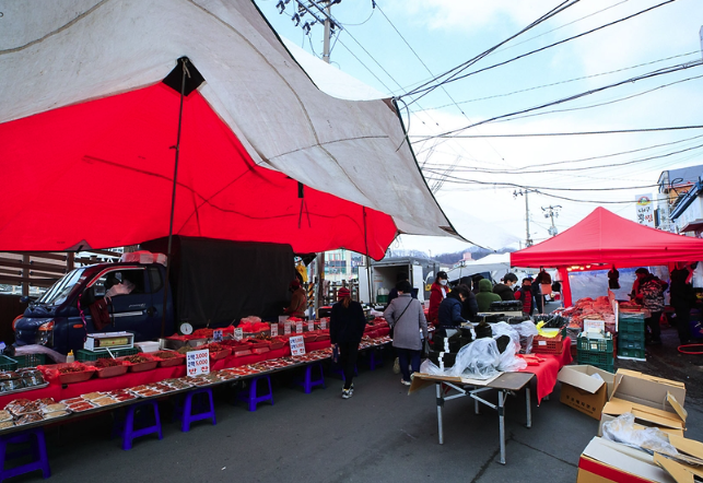 A: 장터 내 2곳과 주변 공공시설 3곳에 공중화장실이 있습니다. 모두 무료로 이용 가능합니다.
