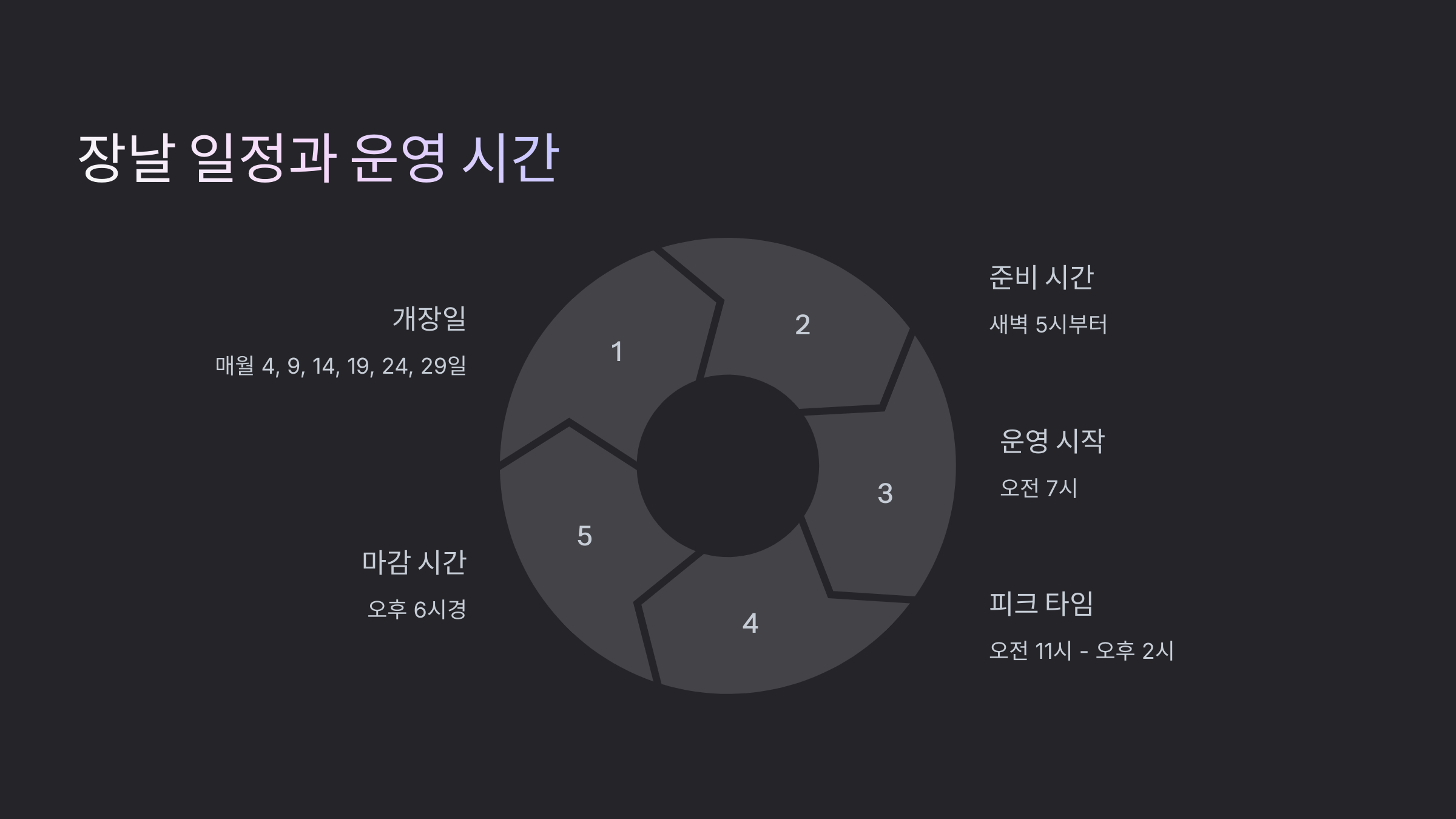 | 개장일 | 매월 4, 9, 14, 19, 24, 29일 개장 |