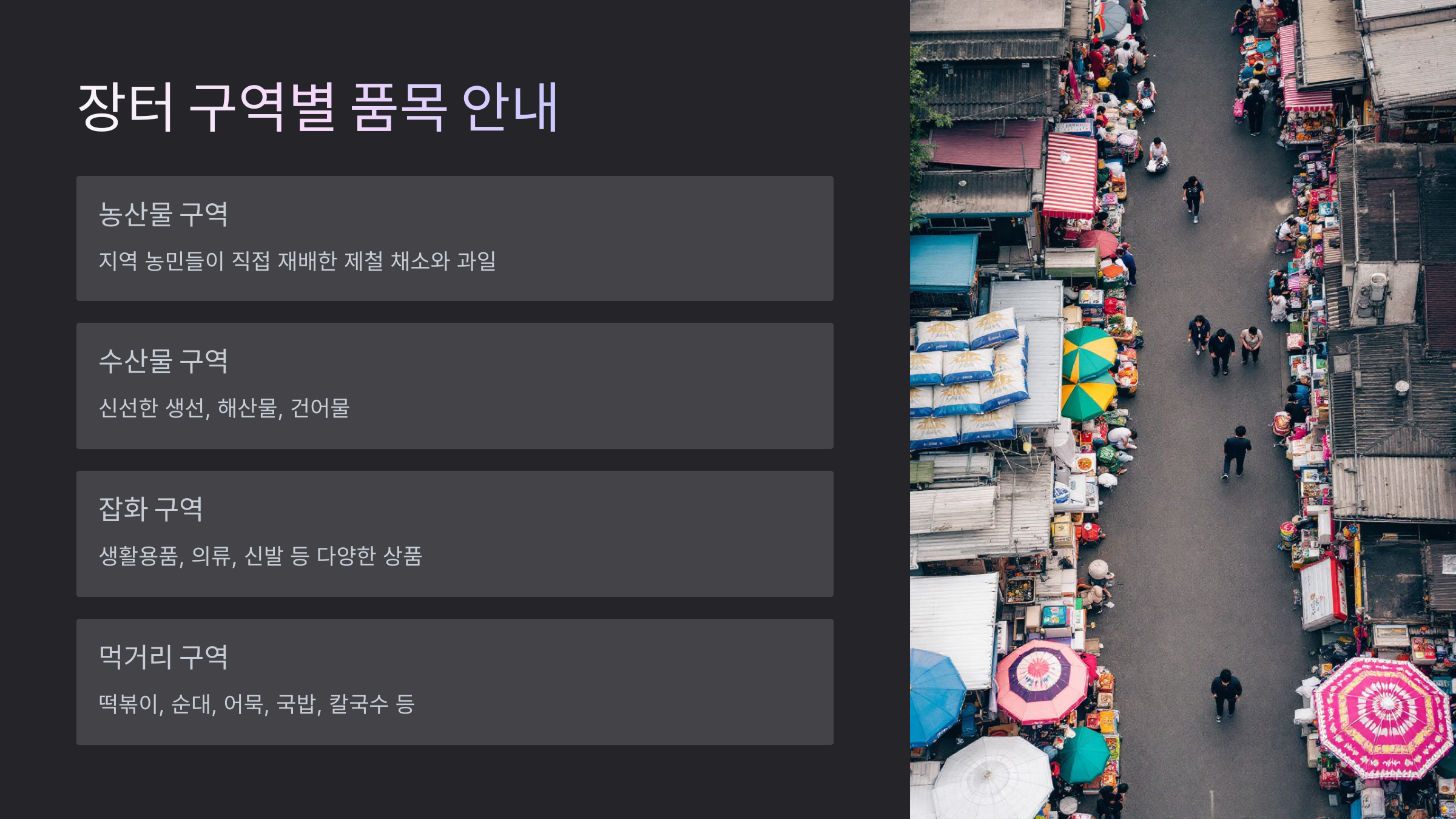 장터 구역별 품목 안내