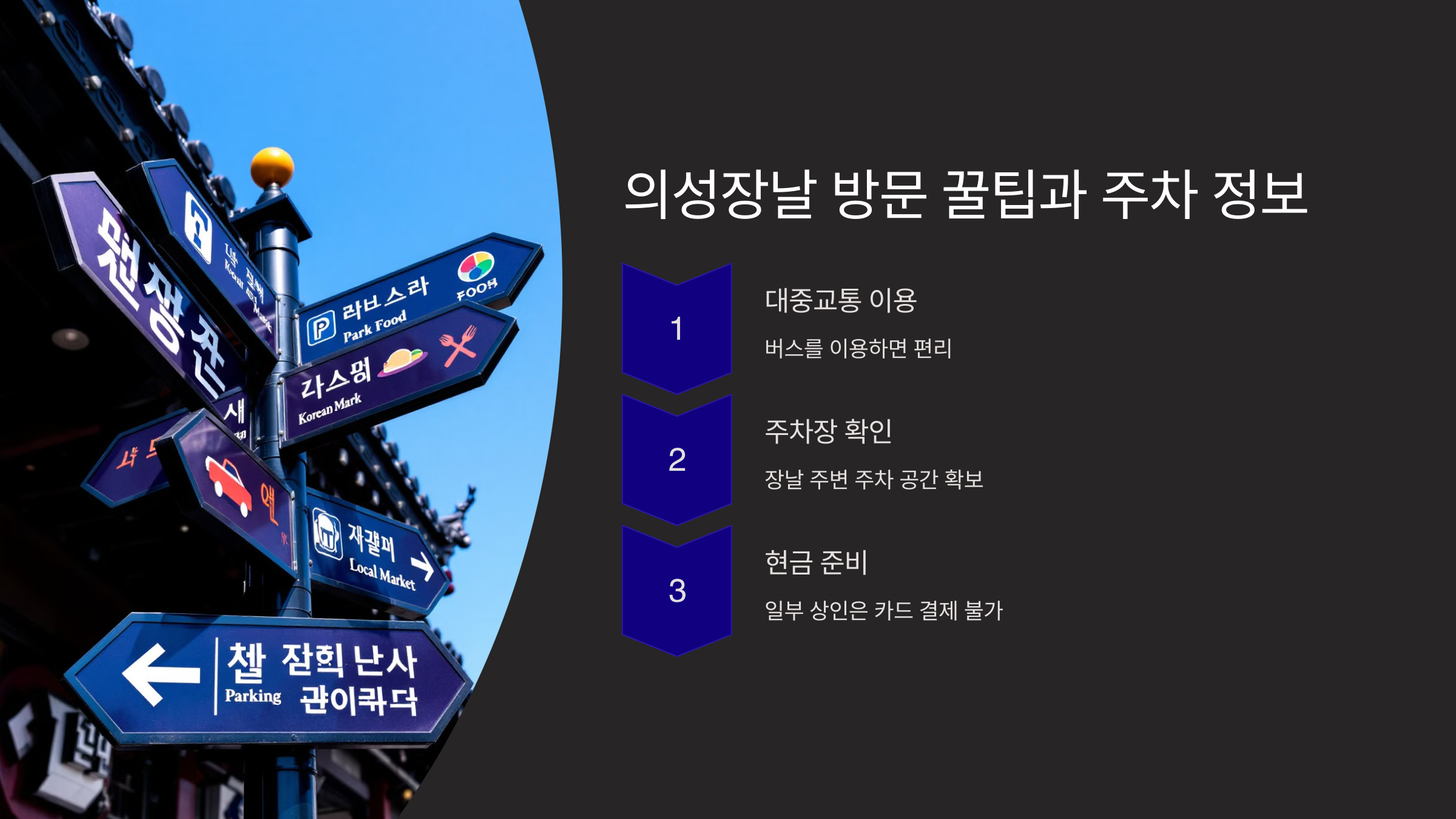 의성 5일장을 더욱 편리하게 즐기기 위해서는 몇 가지 팁을 알아두는 것이 좋아요. 특히 장날에는 사람이 몰리기 때문에 미리 준비하면 더욱 쾌적하게 시장을 둘러볼 수 있답니다! 🛍️🚗