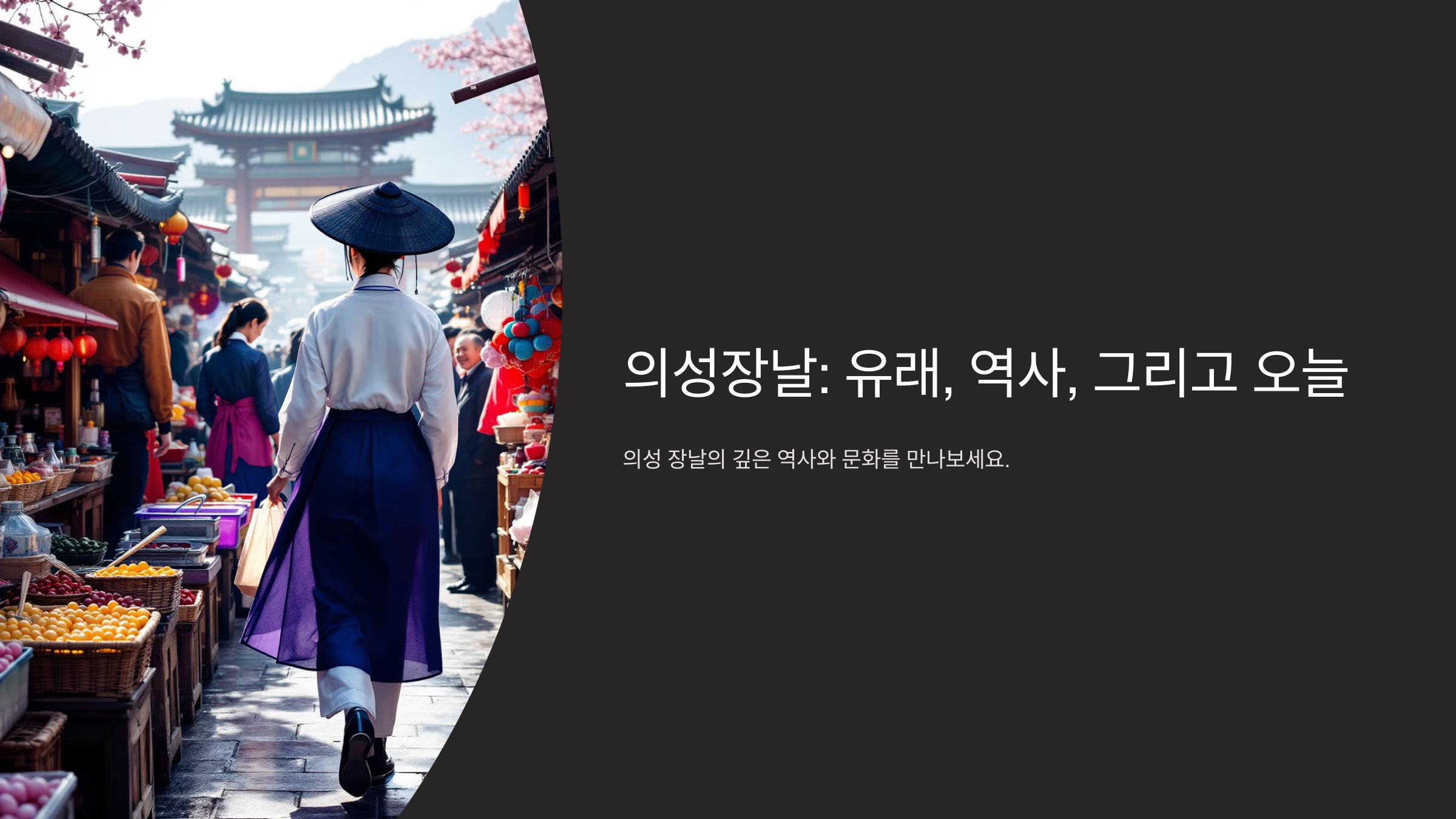 의성장날은 조선 시대부터 이어져 온 전통적인 5일장이에요. 과거 교통이 불편하던 시절, 농민들과 상인들이 정해진 날에 모여 물건을 사고팔던 것이 5일장의 시작이었어요. 이 전통은 지금까지도 이어지고 있답니다. 🏮