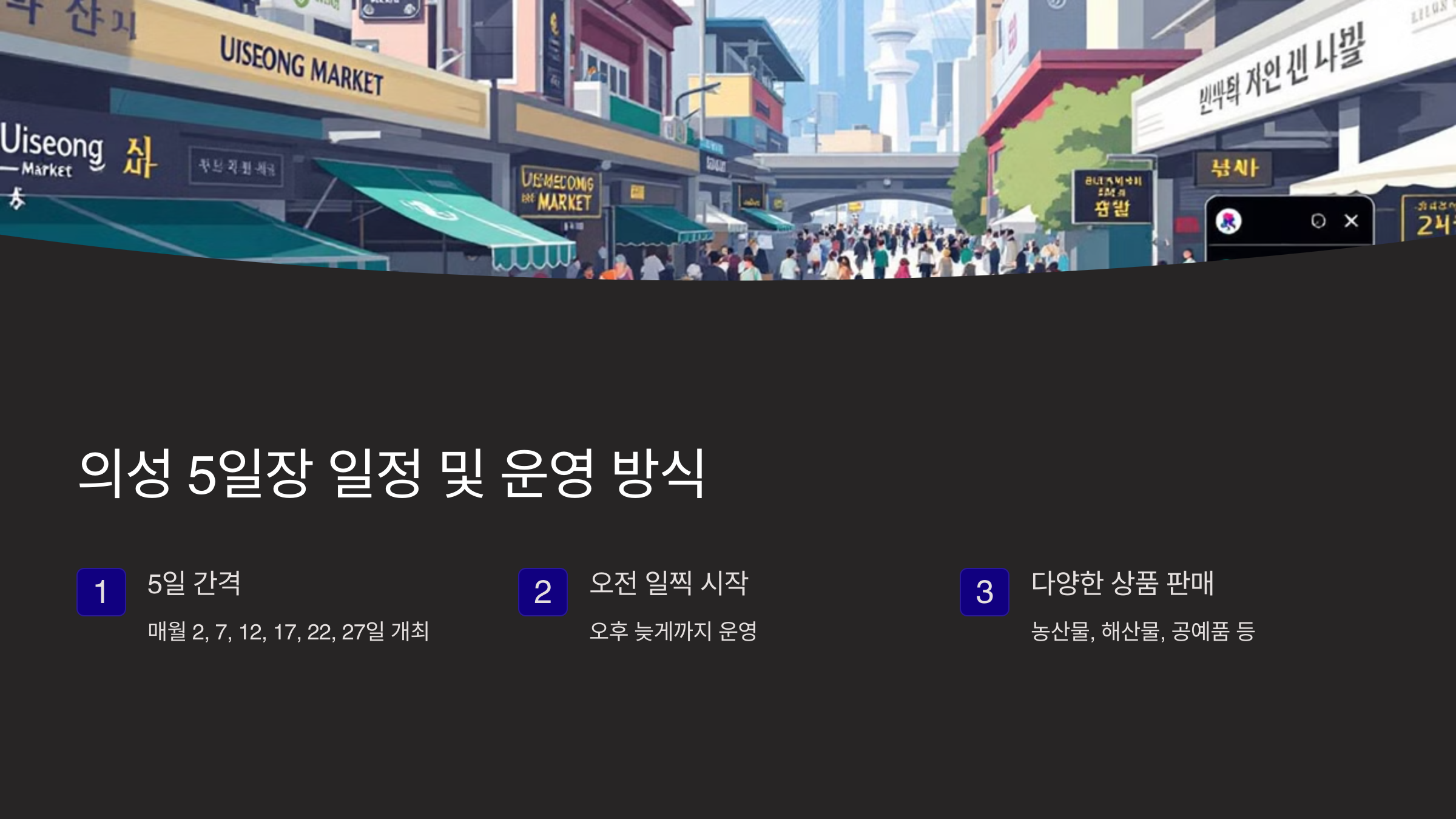 이처럼 의성 5일장은 매달 같은 일정으로 열려요. 장날을 최대한 즐기려면 오전 9시~11시 사이에 방문하는 것이 가장 좋아요. 이 시간대에는 상품도 가장 많고, 사람들도 많아서 시장 특유의 활기찬 분위기를 경험할 수 있답니다! 🎉