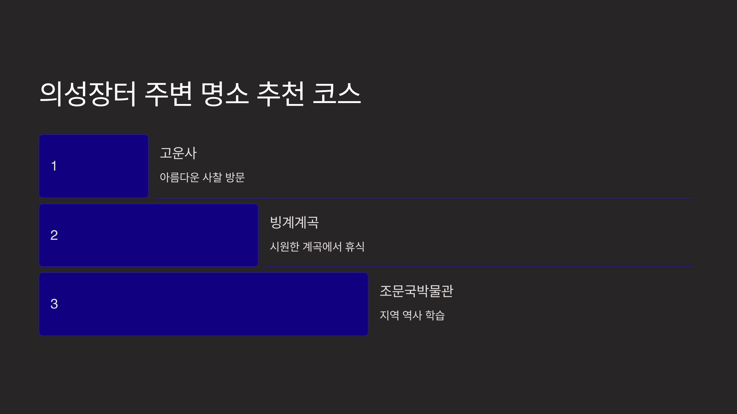 의성 5일장을 방문했다면 시장뿐만 아니라 주변 명소도 함께 둘러보는 것을 추천해요! 의성에는 자연경관이 아름답거나 역사적인 의미가 있는 장소들이 많답니다. 🏞️🏛️