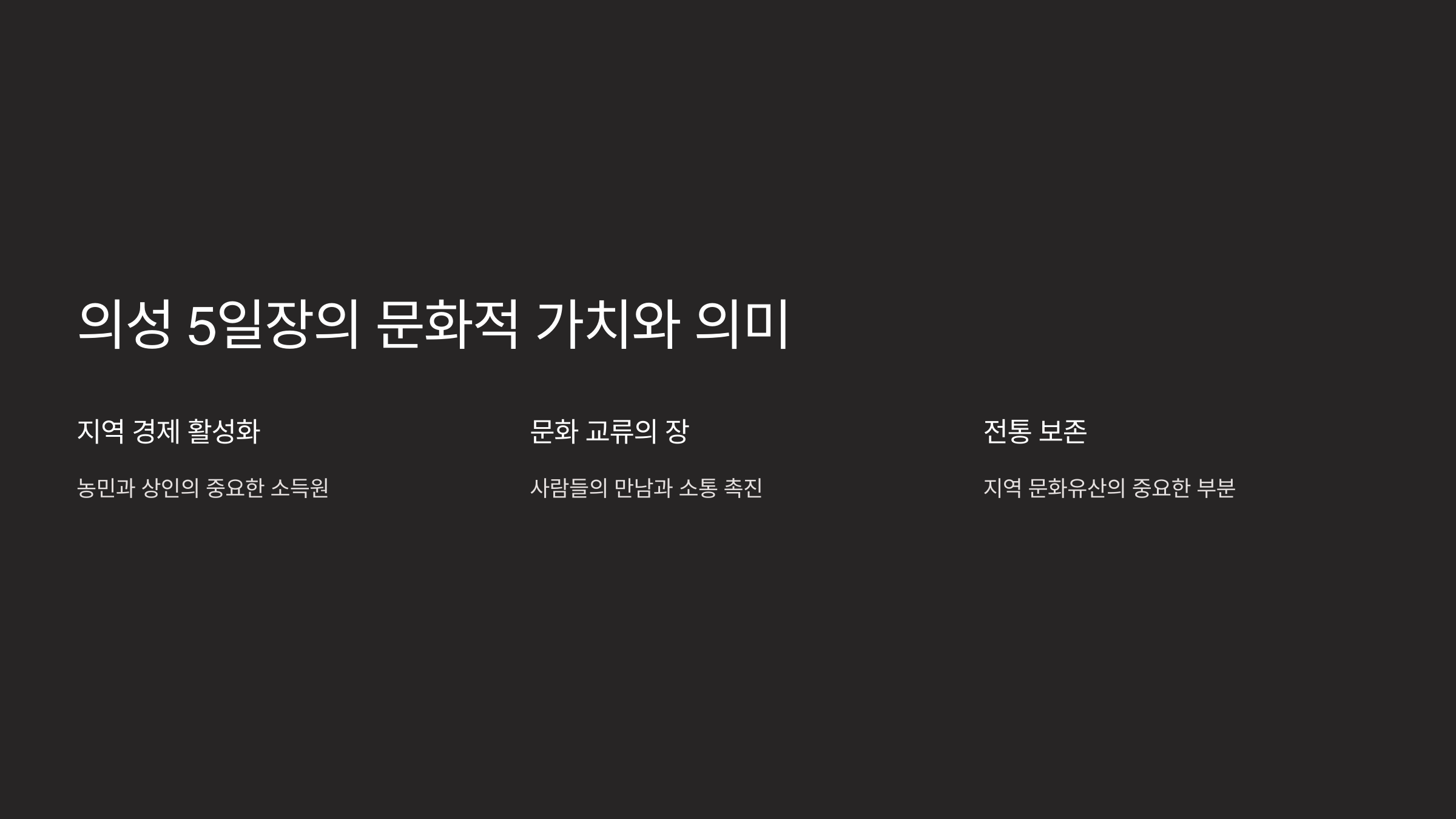 의성 5일장은 단순히 물건을 사고파는 시장이 아니라, 지역 공동체가 모여 소통하는 장터예요. 장날마다 마을 사람들이 모여 담소를 나누고, 새로운 정보를 교환하는 장으로서의 역할도 하고 있어요. 🏮