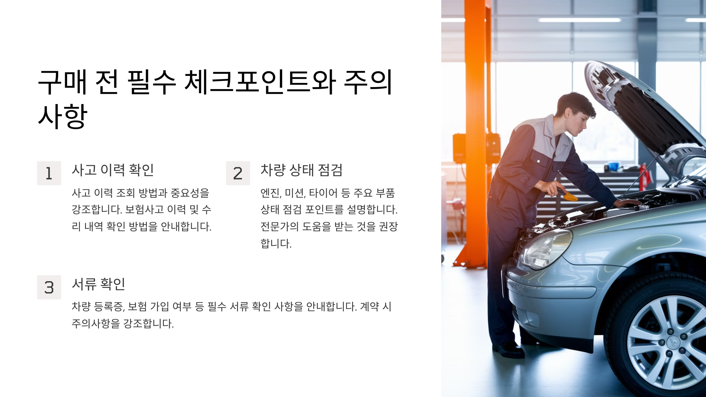 - 차량 상태 점검: 차량의 외관 상태, 엔진 및 미션 상태, 타이어 상태 등을 꼼꼼하게 점검해야 합니다. 가능하다면, 전문 정비사의 도움을 받아 차량 상태를 점검하는 것이 좋습니다.