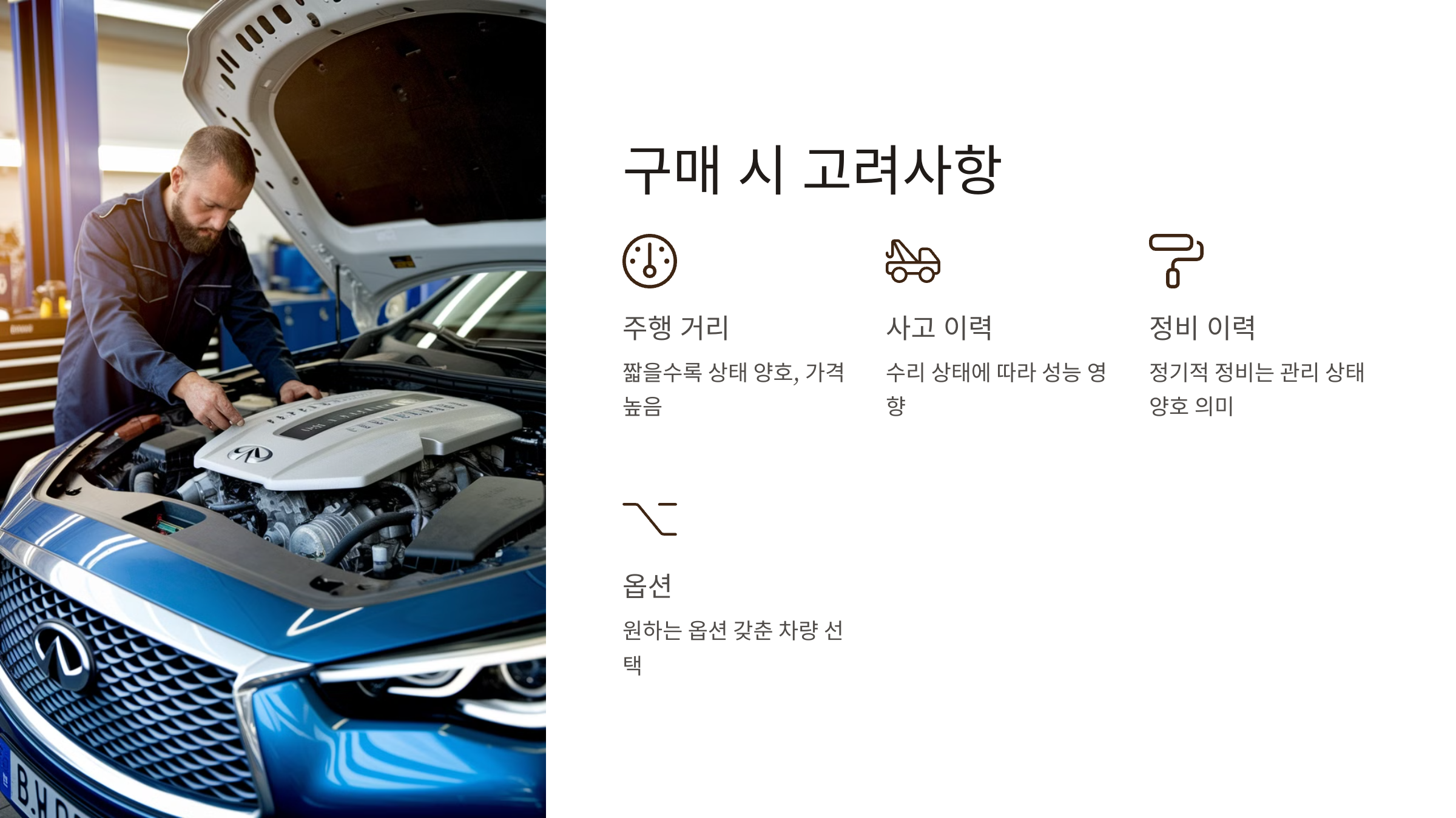 - 사고 이력: 사고 이력이 있는 차량은 가격이 저렴하지만, 수리 상태에 따라 차량의 성능에 영향을 미칠 수 있습니다. 사고 이력 확인은 필수입니다.
