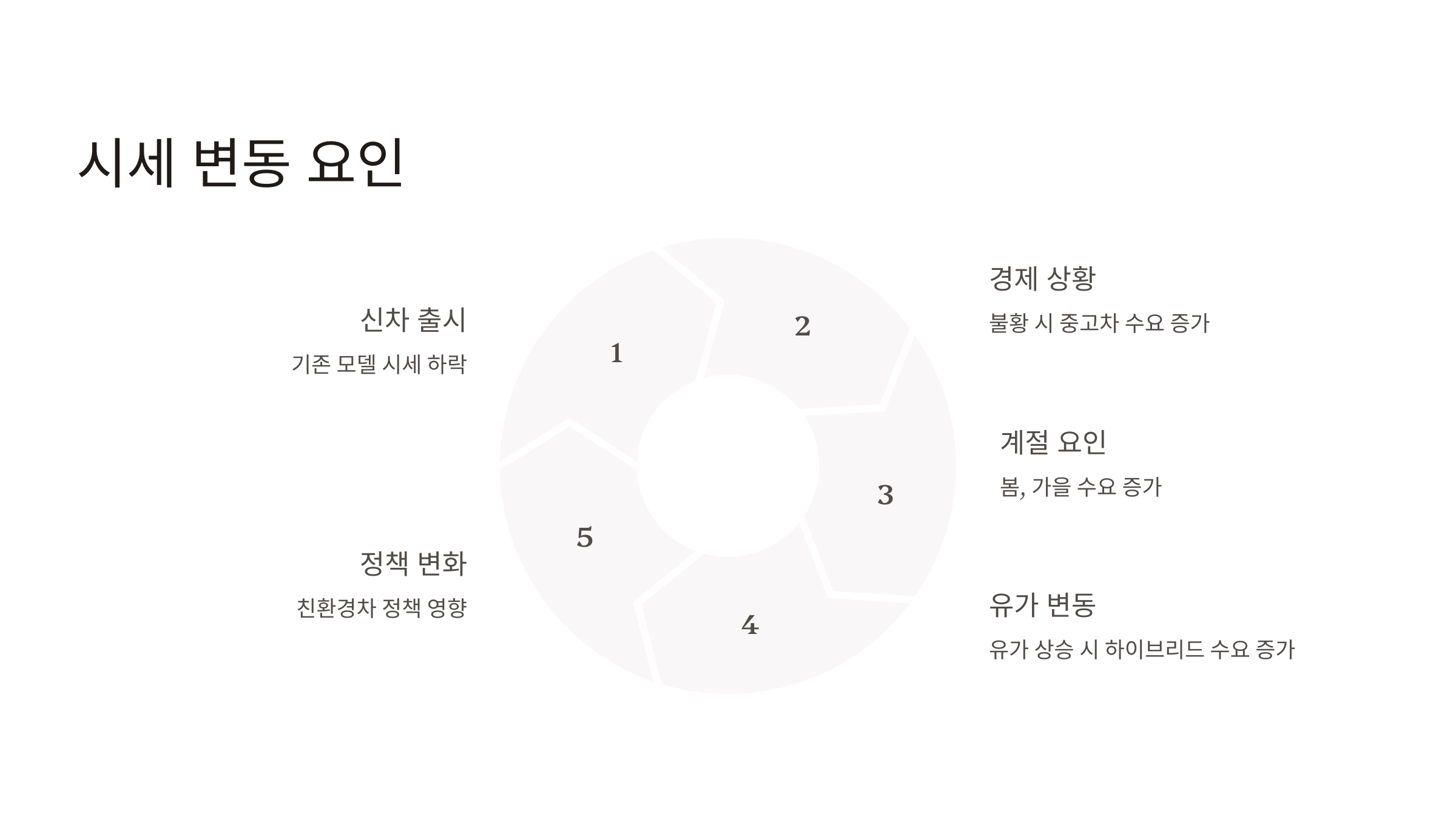 - 유가 변동: 유가 상승 시 연비가 좋은 하이브리드 차량의 수요가 증가하여 중고차 시세가 상승할 수 있습니다.
