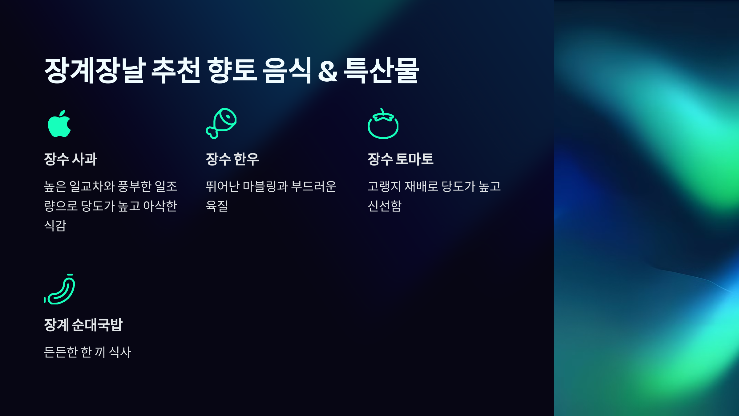 | 장수 사과 | 높은 일교차와 풍부한 일조량으로 당도가 높고 아삭한 식감 | 가을 |