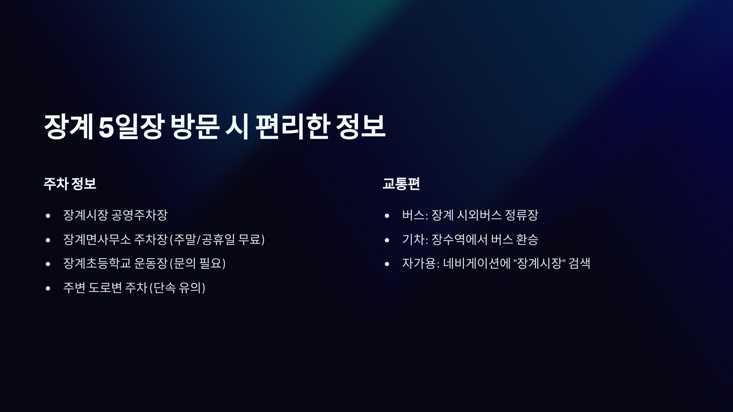 4. 장계 5일장 방문 시 편리한 주차 정보 및 교통편 안내