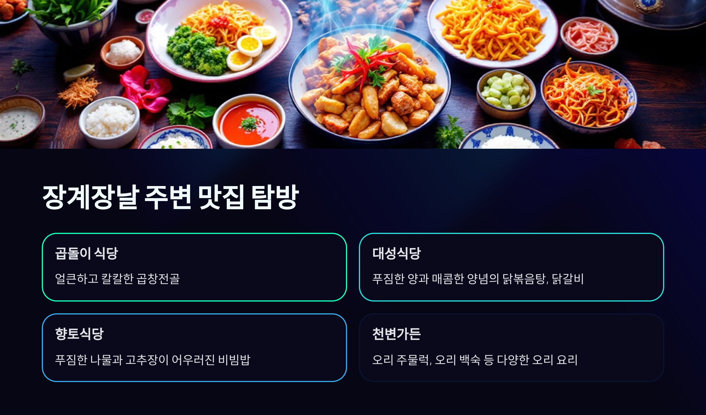 장계장날 구경 후 허기진 배를 채우기 위해 주변 맛집을 찾는다면, 현지인들이 추천하는 숨은 보석 같은 맛집들을 방문해보세요.