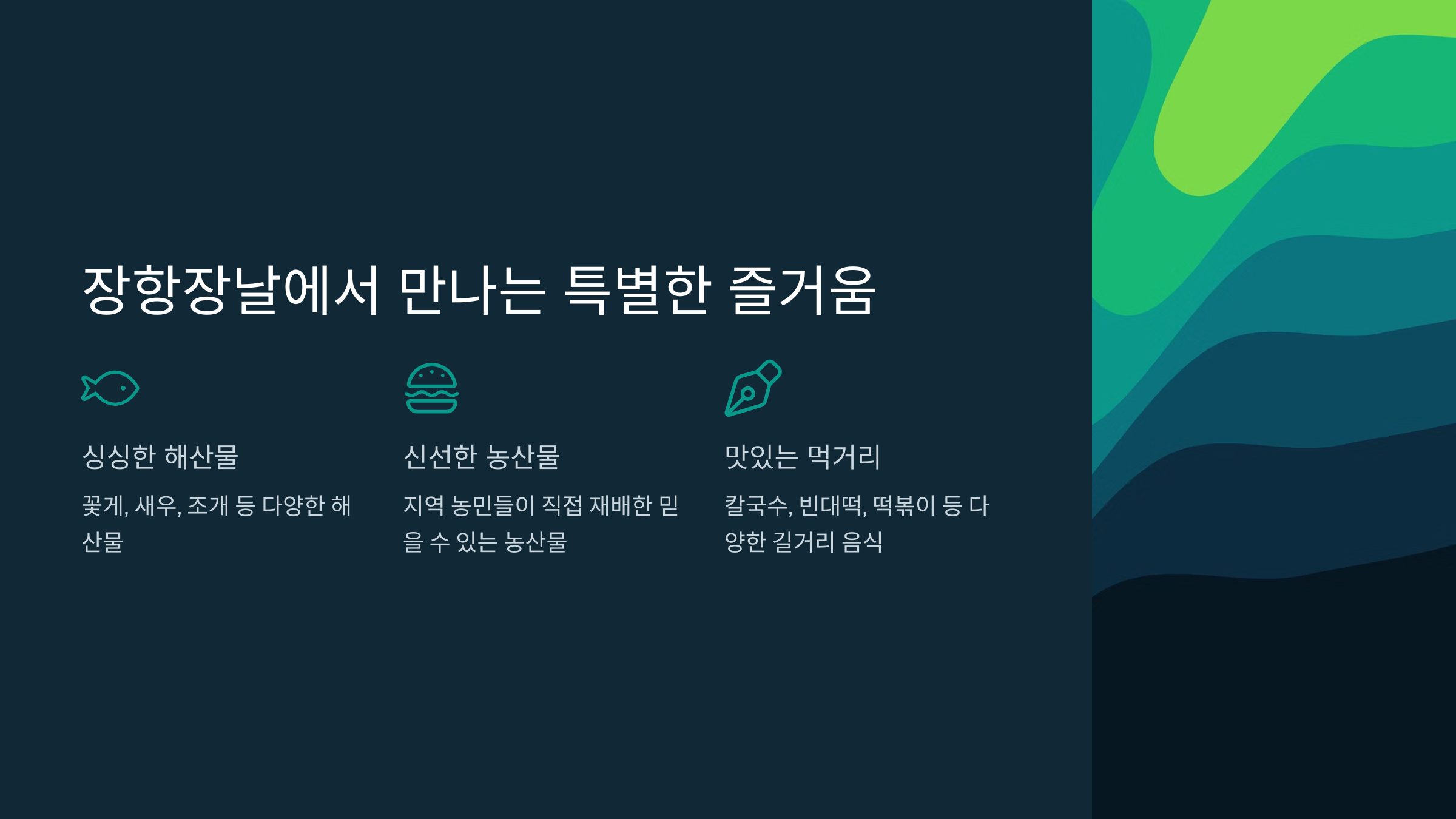 주요 상품 | 싱싱한 해산물 (꽃게, 새우, 조개 등), 신선한 농산물, 생활용품 등 |