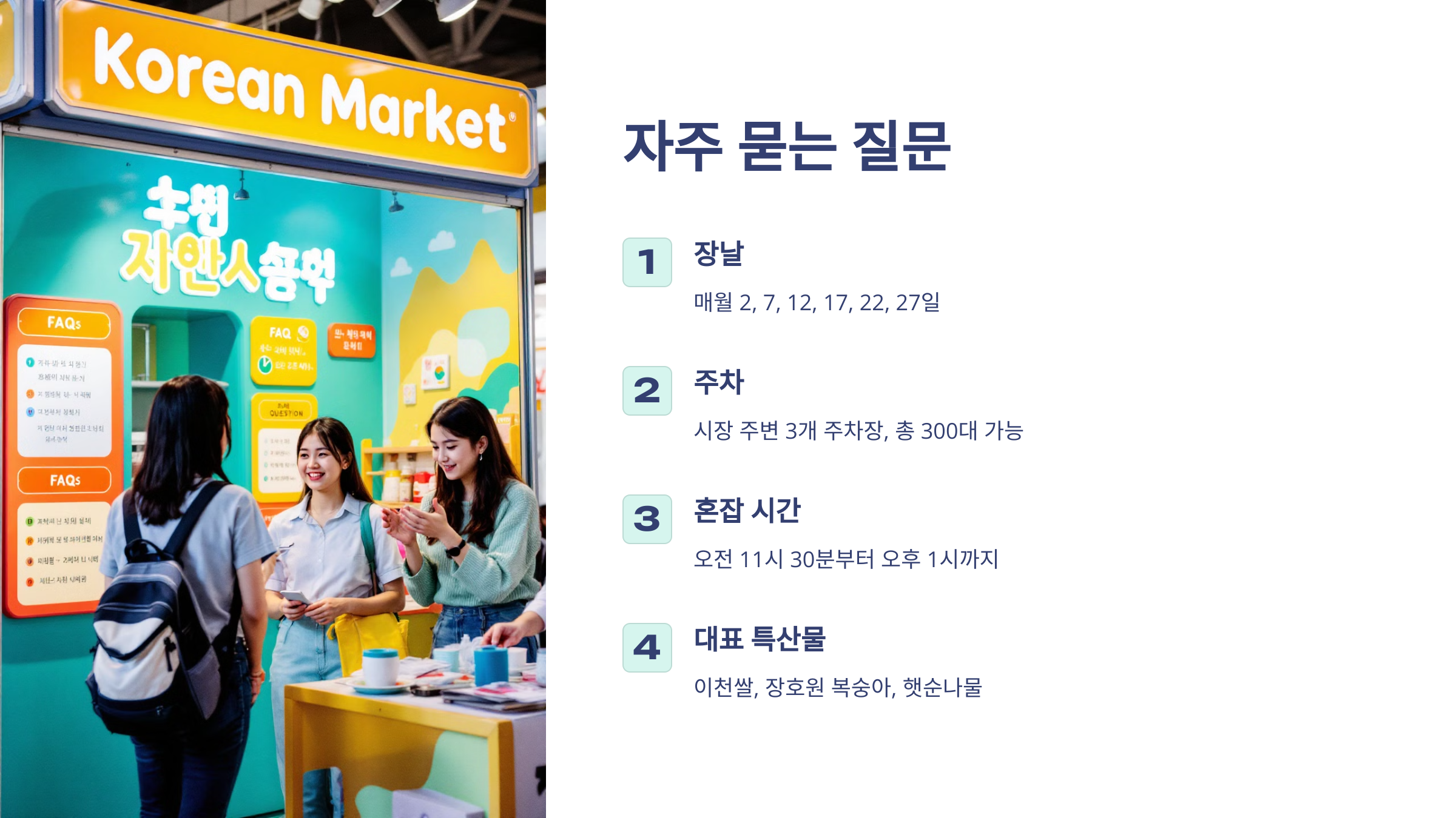 - 시장 주변 3개 주차장에 총 300대 주차 가능합니다.