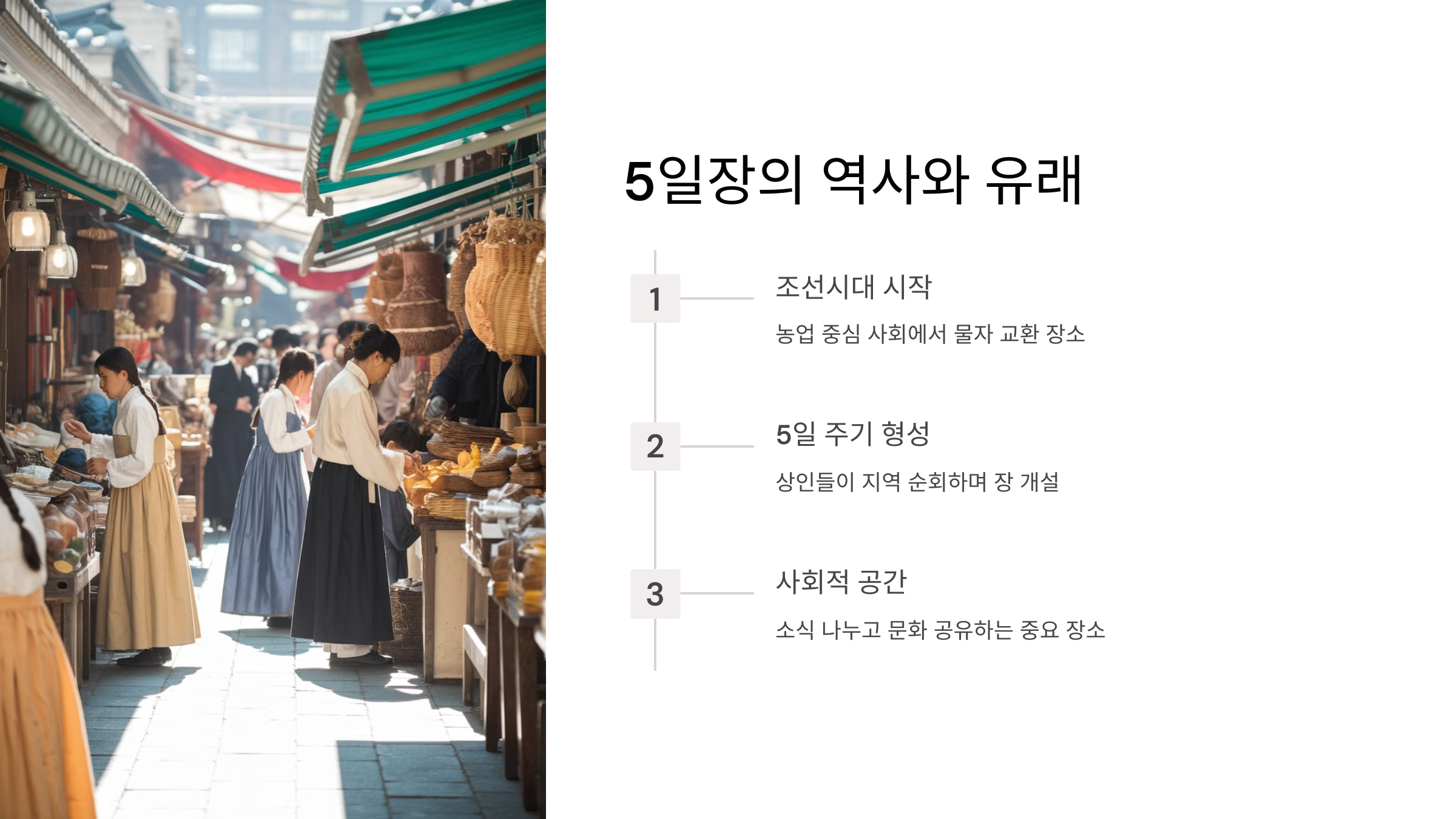 5일장은 조선시대부터 시작된 전통 시장 문화로, 농업 중심의 사회에서 물자 교환과 소통의 장으로 자리 잡았습니다. 당시 교통이 발달하지 않았던 시절, 상인들은 일정한 주기로 각 지역을 순회하며 장을 열었고, 이 주기가 5일로 정해지면서 '5일장'이라는 이름이 붙게 되었습니다.