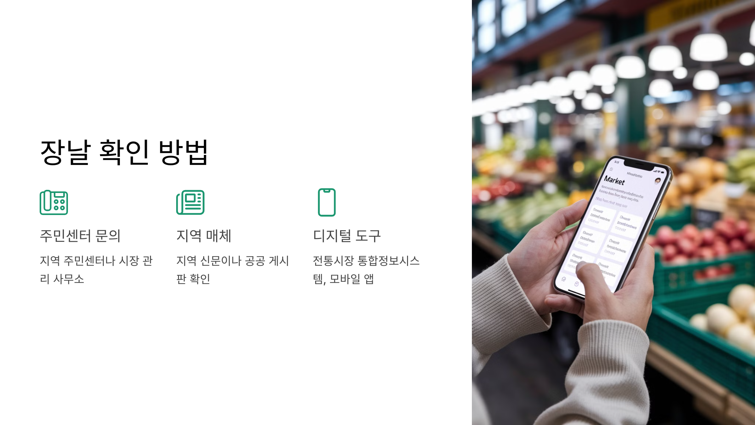 현대에는 인터넷과 모바일 앱을 통해 전국5일장 일정을 쉽게 확인할 수 있습니다. '전통시장 통합정보시스템'과 같은 웹사이트에서는 전국의 5일장 정보를 제공하며, 모바일 앱을 통해 실시간으로 장날과 위치를 검색할 수도 있습니다. 이러한 디지털 도구를 활용하면 더욱 편리하게 장터를 방문할 수 있습니다.