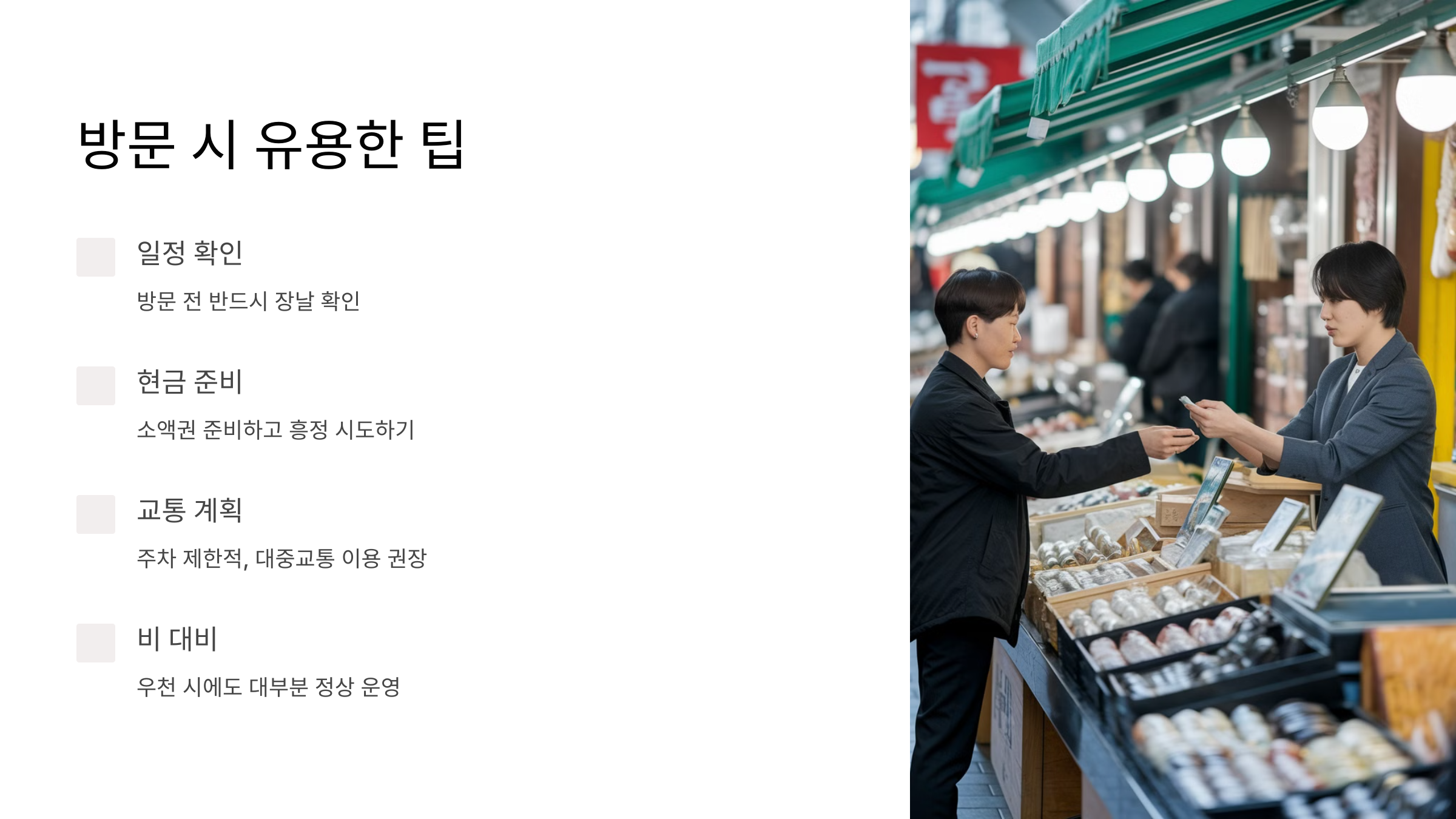대부분의 5일장은 주차 공간이 제한적이므로 대중교통 이용을 추천합니다.